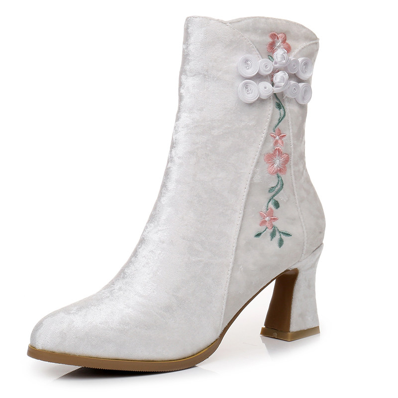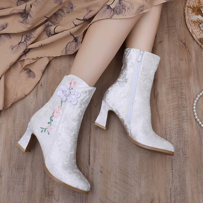 国风潮鞋刺绣中筒靴短靴女鞋春秋单靴中跟民族风花朵粗跟棉靴加绒