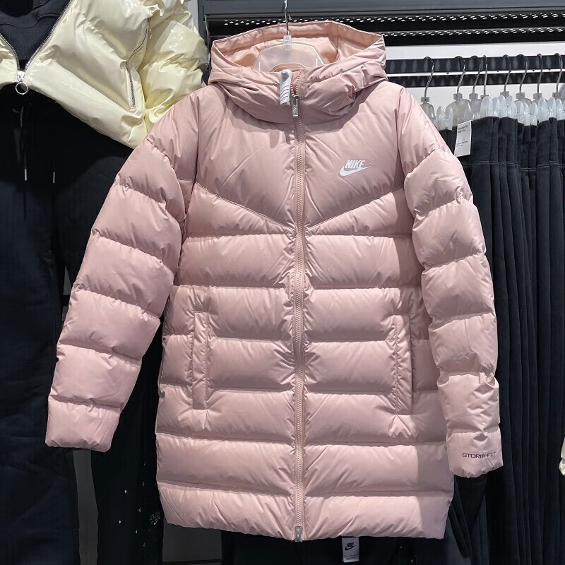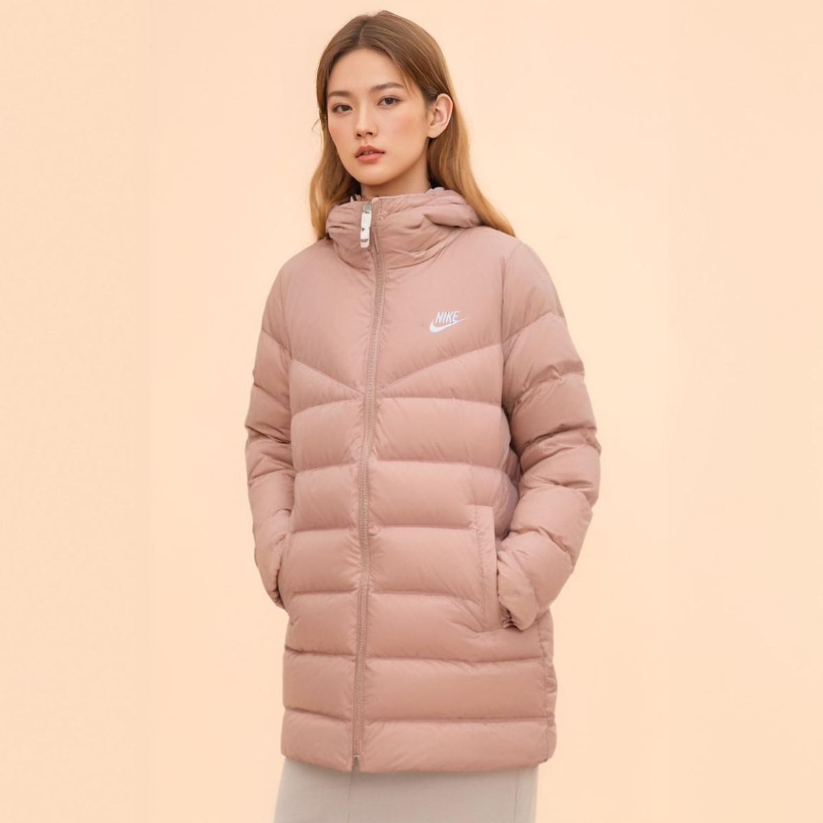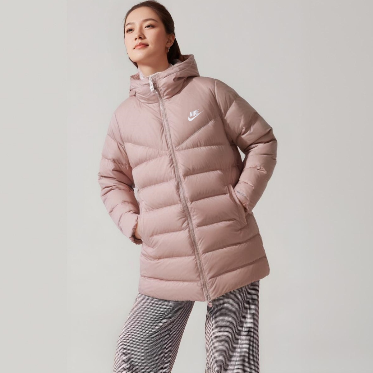 Nike耐克冬季新款中长款羽绒服粉色厚款棉服女连帽保暖运动外套潮