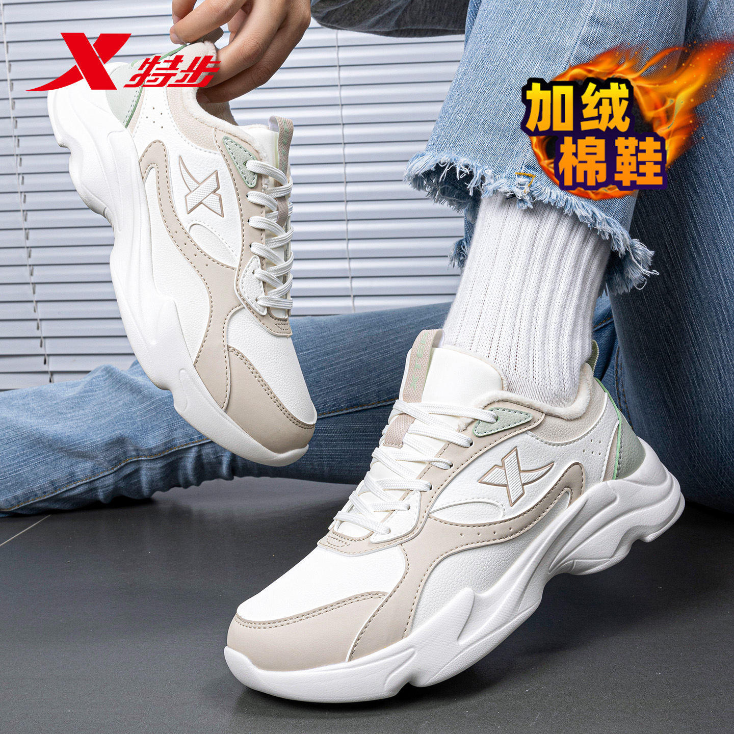 特步女鞋冬季棉鞋加绒加厚防寒保暖皮面老爹鞋女二棉休闲鞋运动鞋