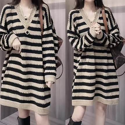 胖人特大码女装条纹中长款针织衫裙子胖mm宽松显瘦V领毛衣连衣裙
