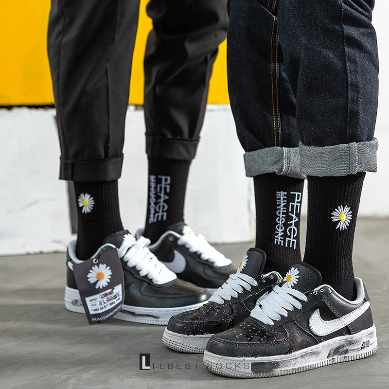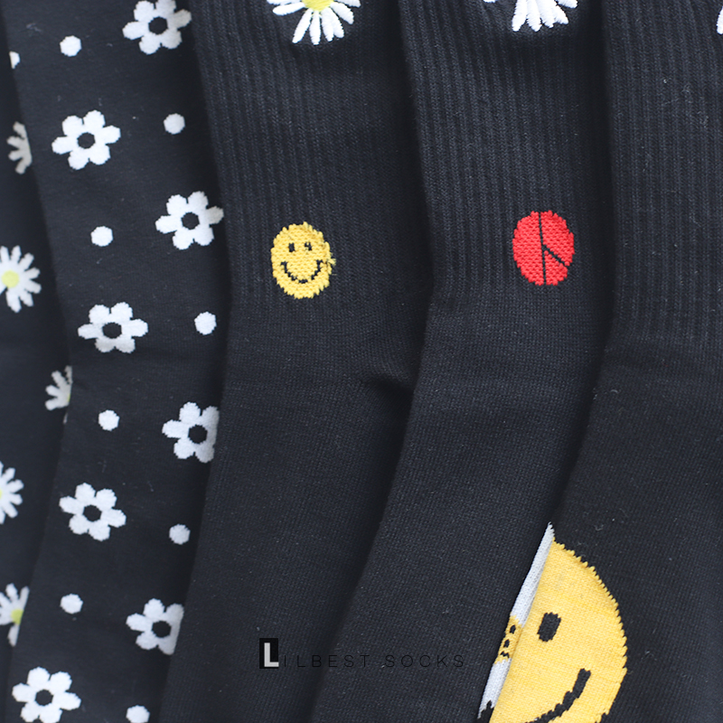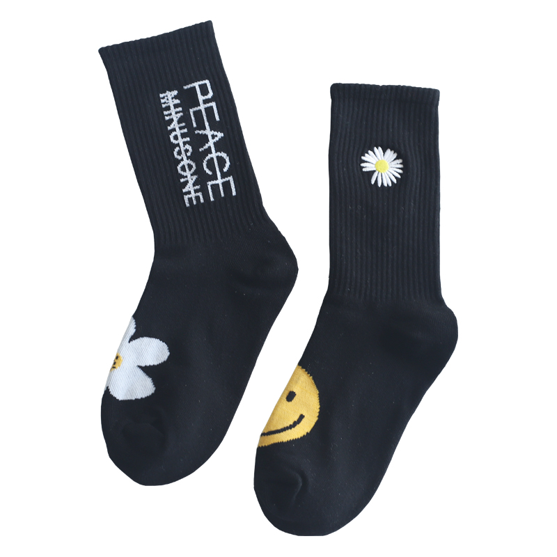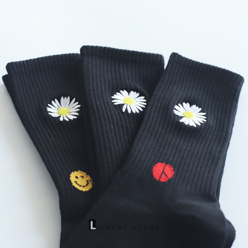 小雏菊刺绣袜子男女情侣春夏纯棉中筒潮袜ins韩国权志龙黑色长袜