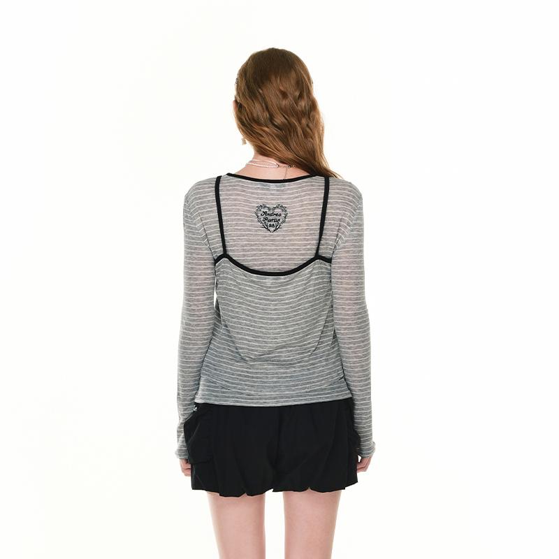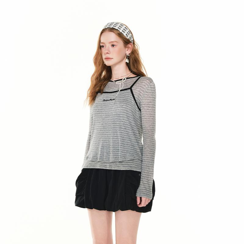 【鞠婧祎同款】Andrea Martin2025秋季新款T恤女圆领长袖条纹上衣