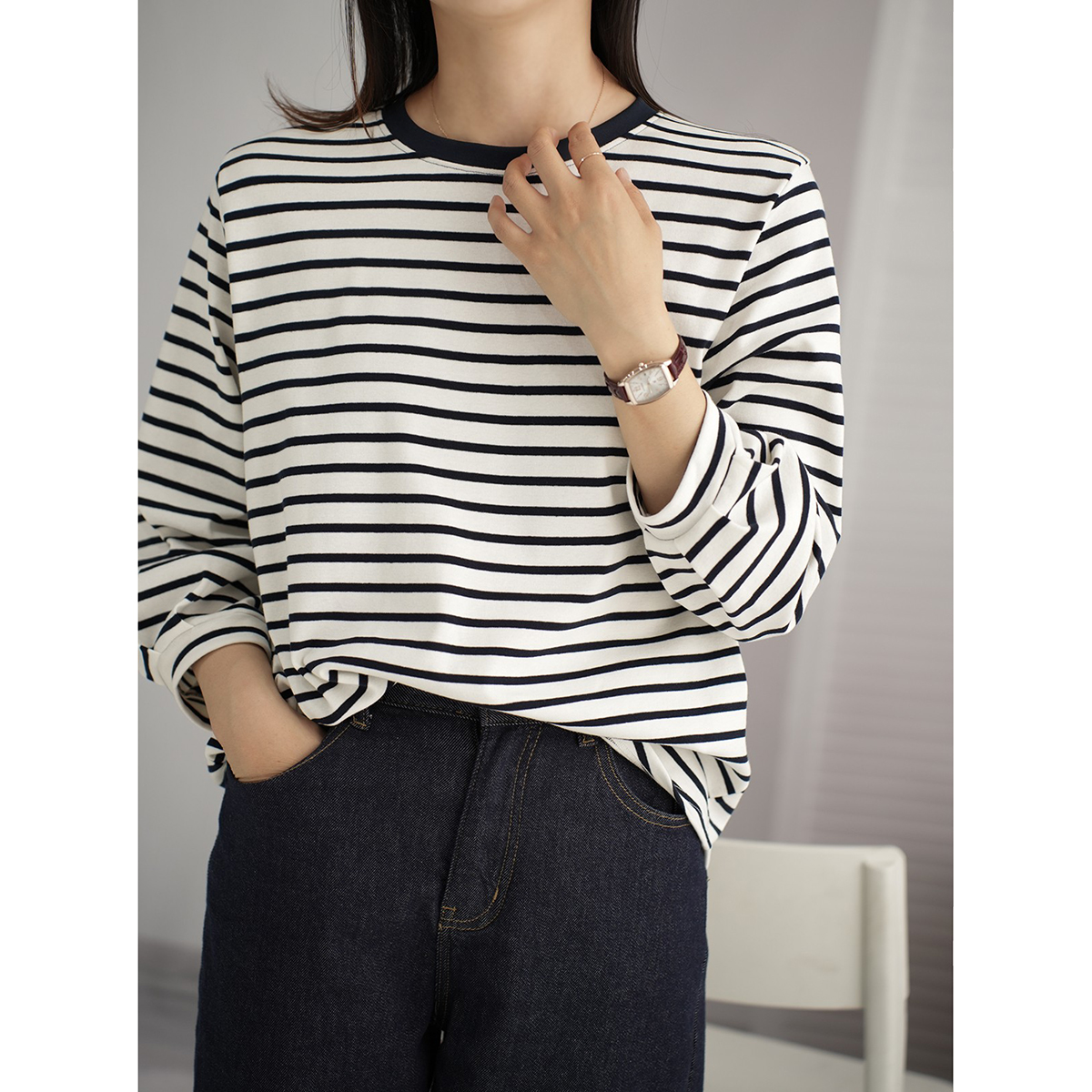 减龄百搭灯笼袖 女士纯棉条纹七分袖T恤 宽松打底衫 女装