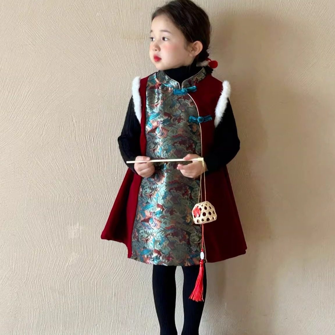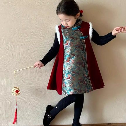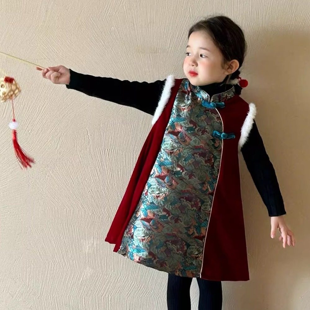 女童新年服新中式儿童镶毛拼色无袖加绒旗袍背心裙