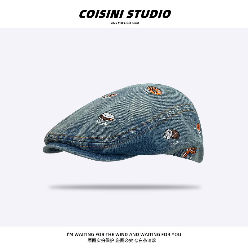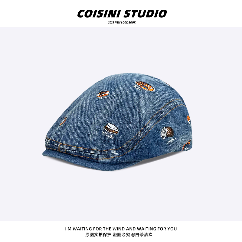 日系复古水洗牛仔前进帽子女生春夏季报童帽鸭舌贝雷帽子男显脸小
