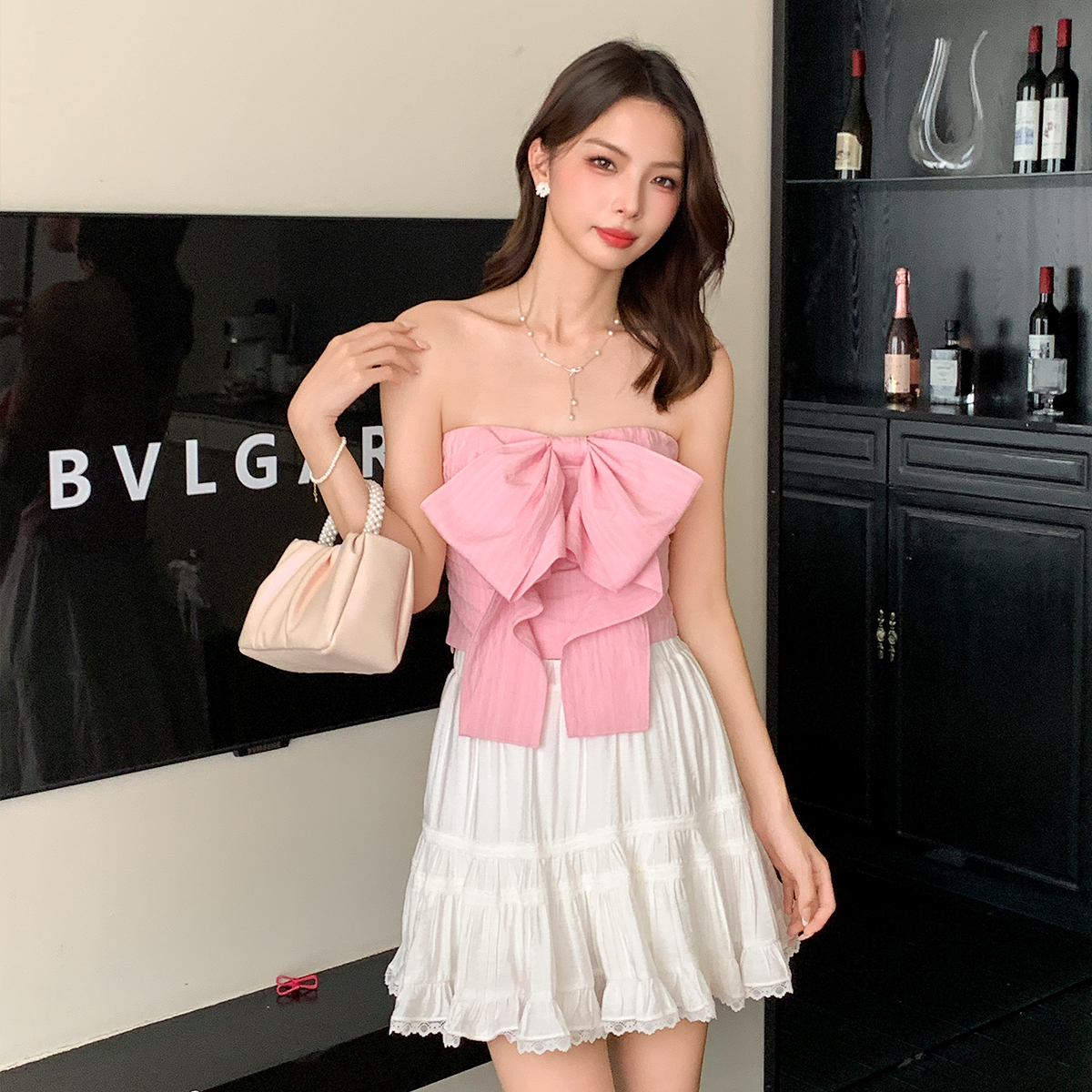 甜美纯欲蝴蝶结抹胸上衣女高级感一字肩辣妹粉色短款小吊带背心