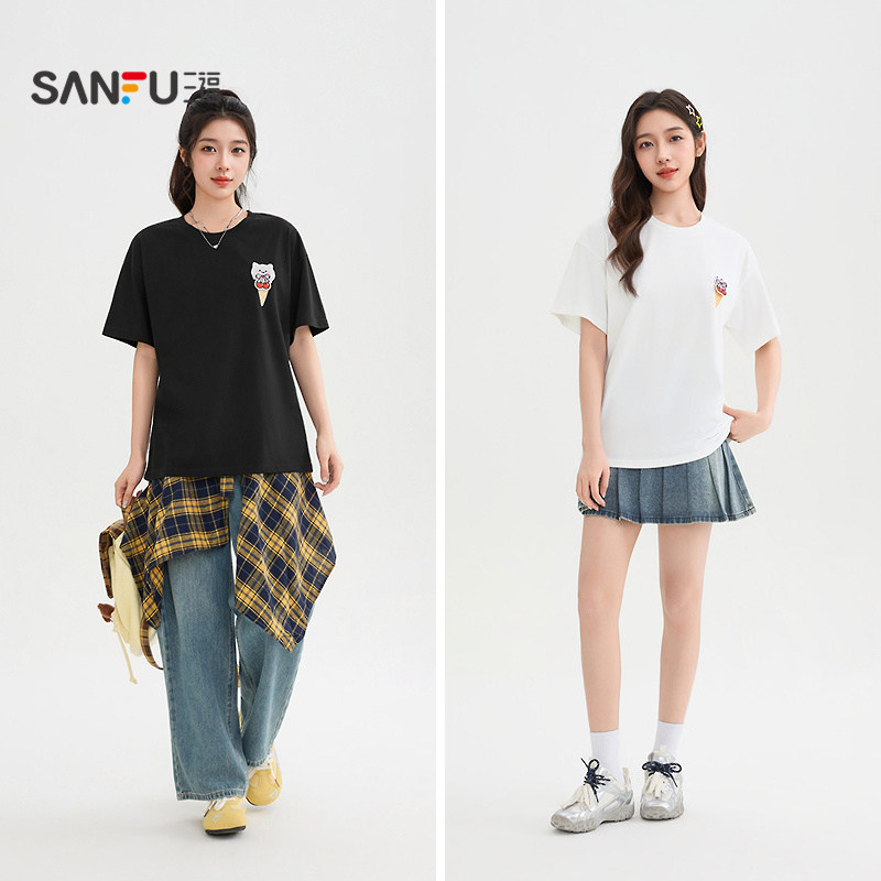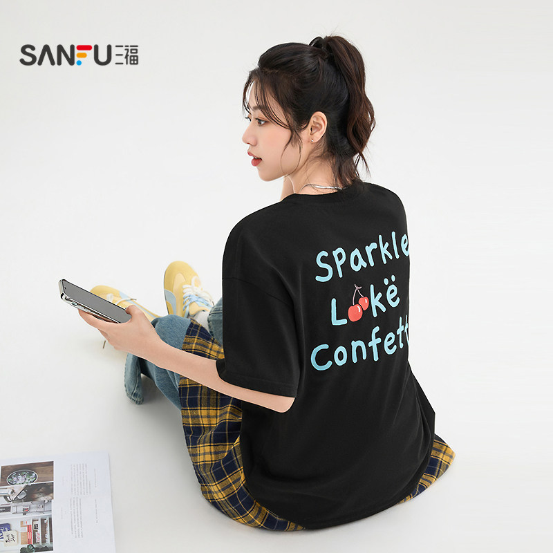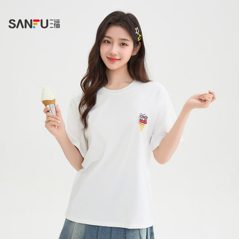 三福T恤女2026新款春季樱桃魔术贴短袖圆领宽松时尚减龄上衣女装