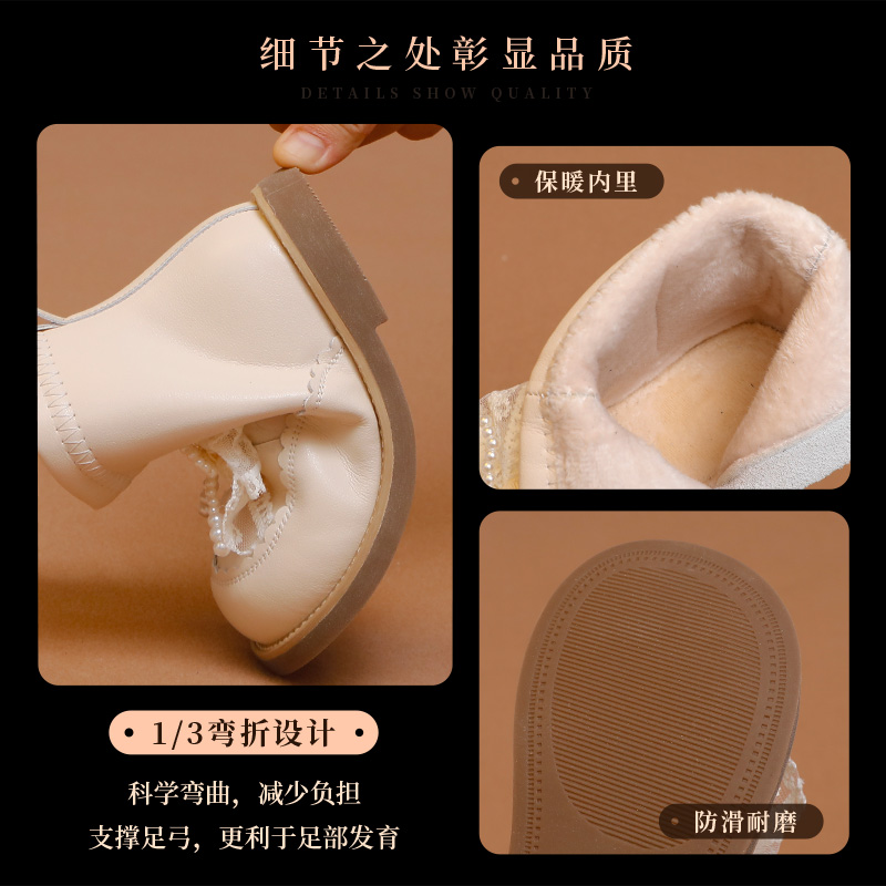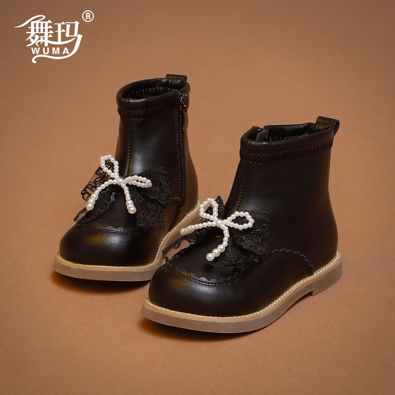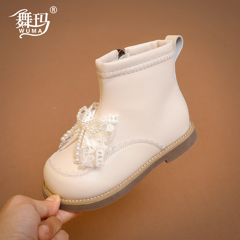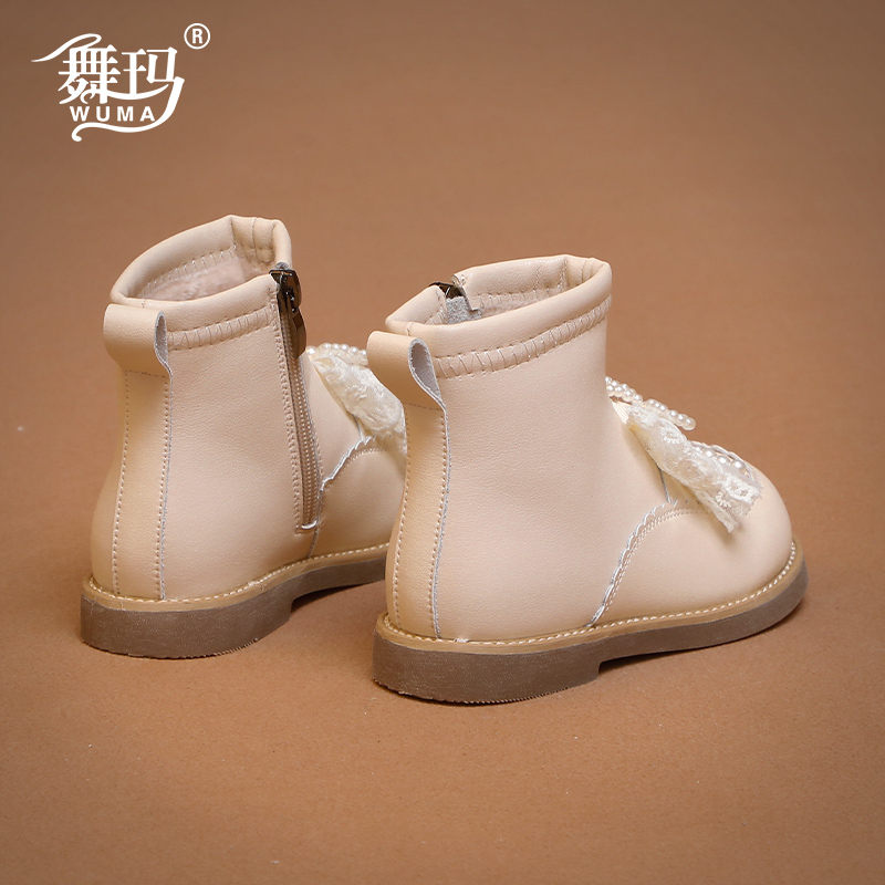 舞玛女童鞋子儿童皮靴2025新款冬季女宝宝加绒蝴蝶结短靴二棉鞋子
