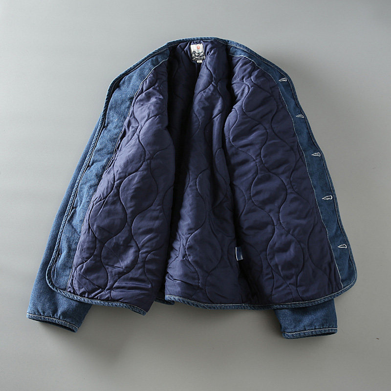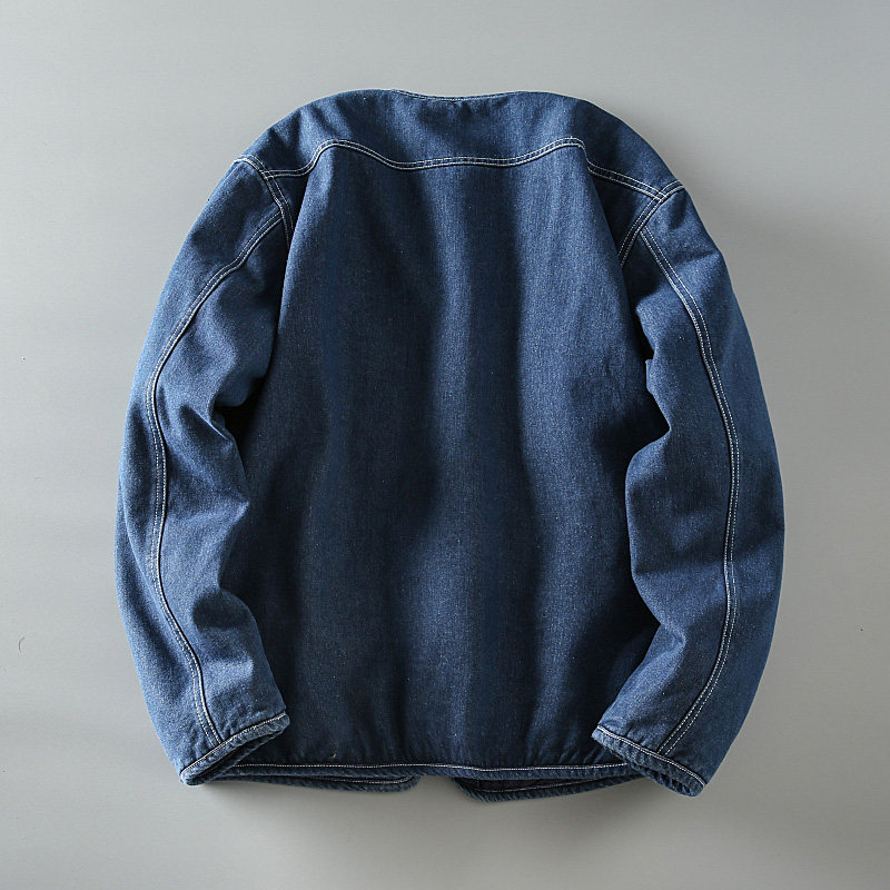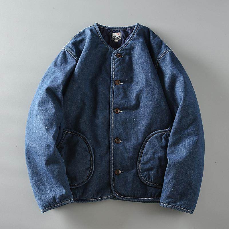 春秋新款日系复古水洗男士情侣款宽松加厚保暖无领牛仔棉服外套潮