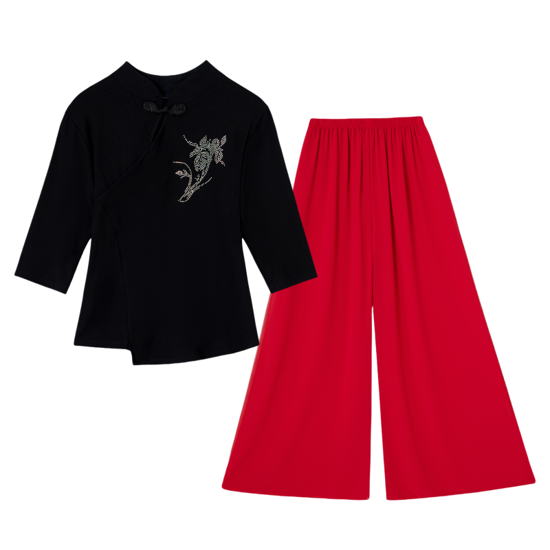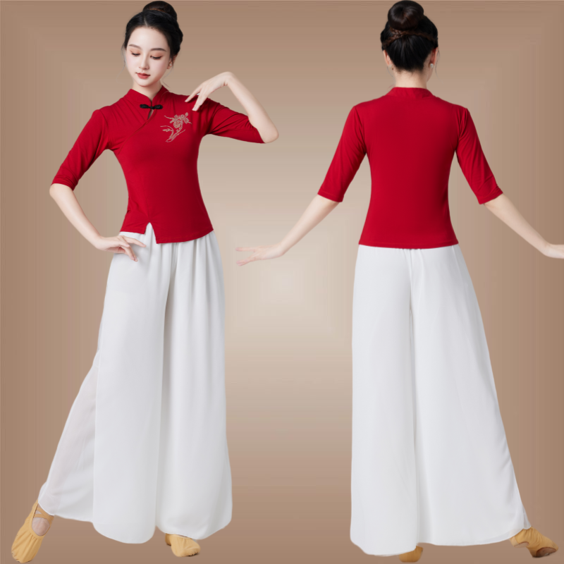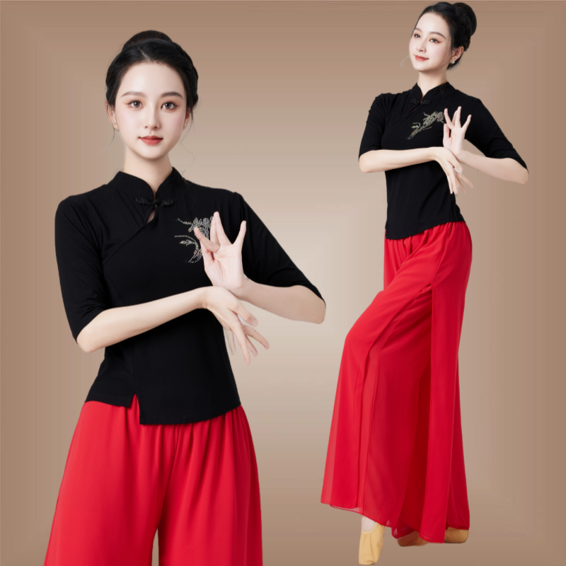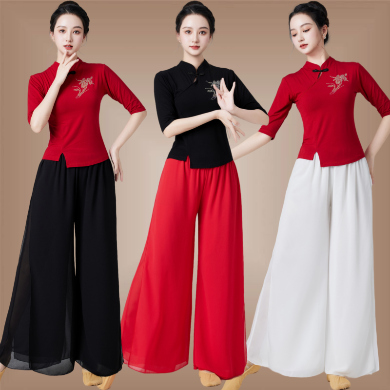 广场舞服装新中式旗袍上衣舞蹈练功服套装雪纺阔腿裤古典舞演出服