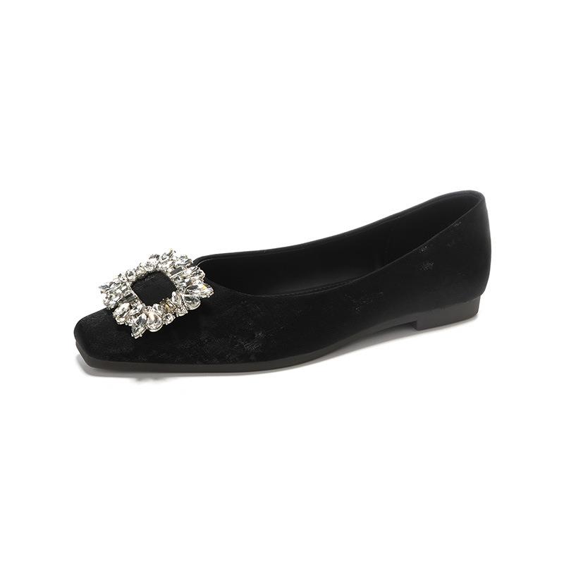 春季新款欧美浅口水钻方头方扣单鞋女黑色职业大码女鞋-