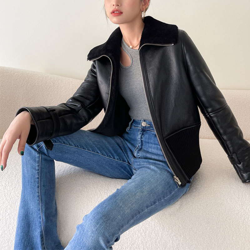 皮毛一体2025年新款女短款仿皮羊羔毛翻领机车夹克海宁皮草外套冬