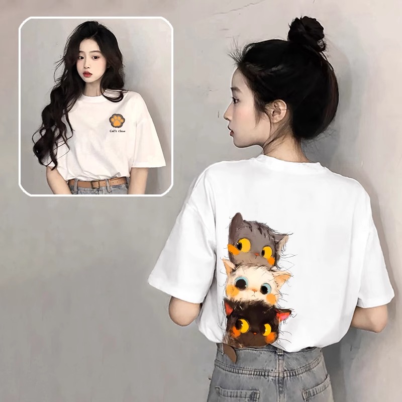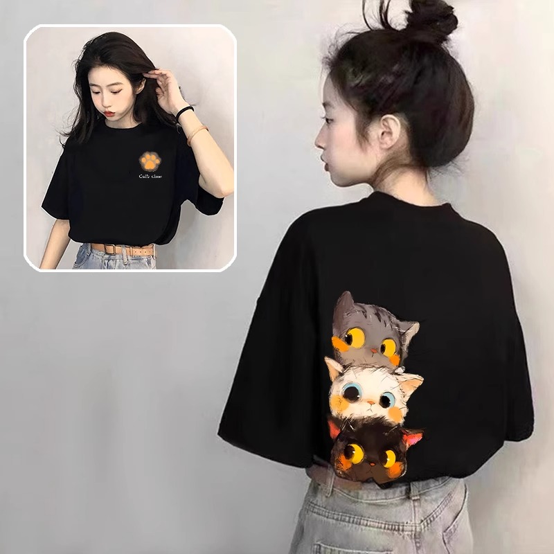 后背大印花卡通猫咪短袖t恤女夏