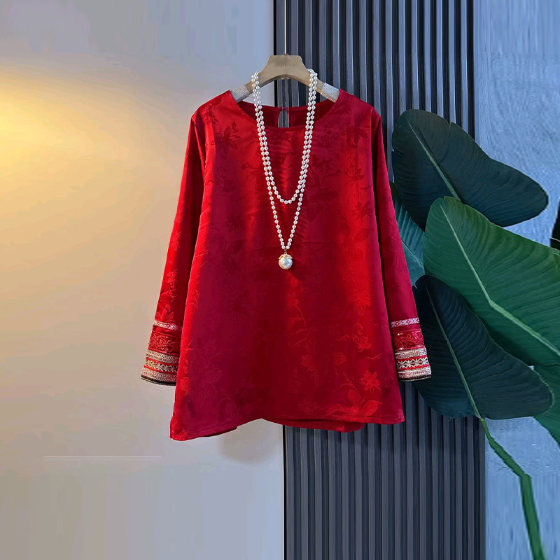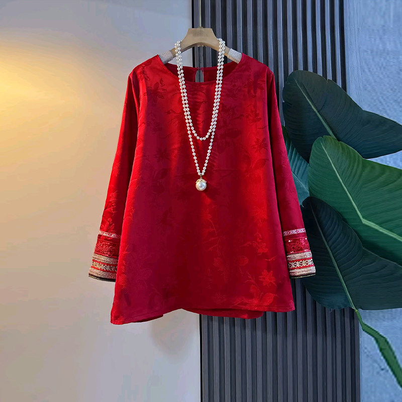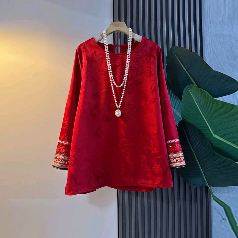加肥拼色袖口圆领暗花上衣2026新年款红色洋气本命年大码女装大衫
