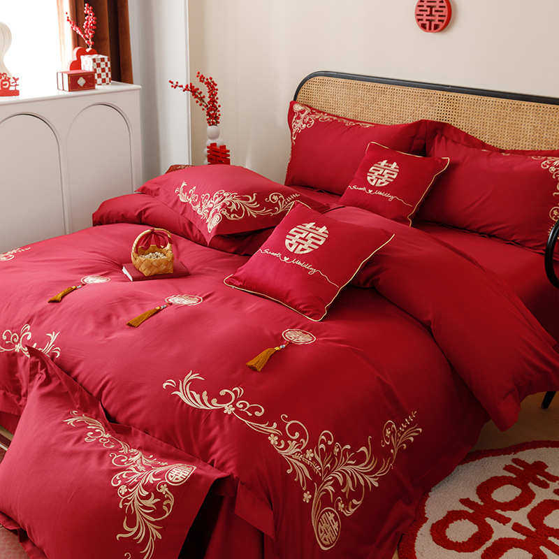 刺绣床中式简约长绒棉结婚件套笠全四红色棉床单喜字婚庆100s被套