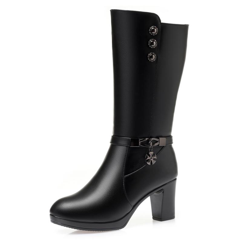 2025秋冬新款加绒真皮靴粗跟黑色妈妈中年女高跟保暖中筒靴长靴子