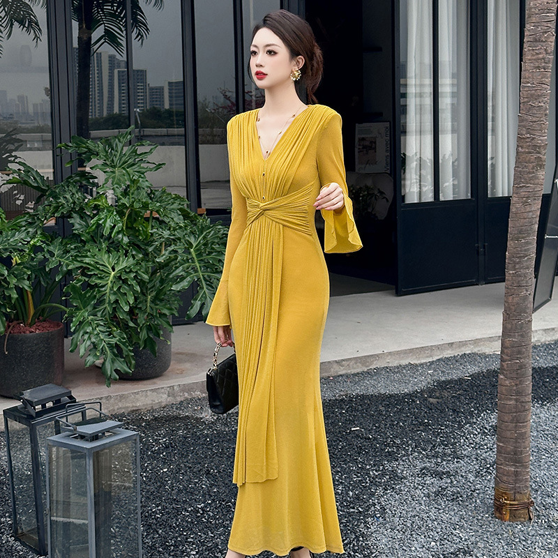 2025秋冬新款法式甜美扭结喇叭袖修身长裙女装时尚设计感连衣裙潮