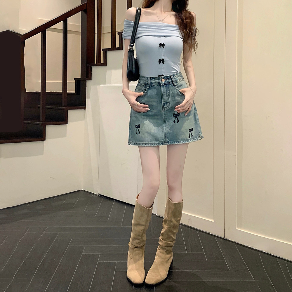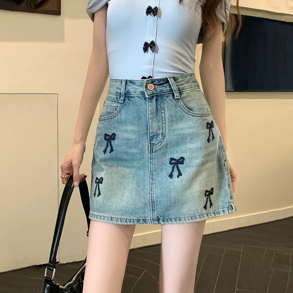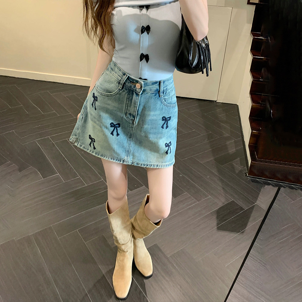 300斤大码胖mm蝴蝶结刺绣牛仔半身裙女夏季2025新款设计感a字短裙