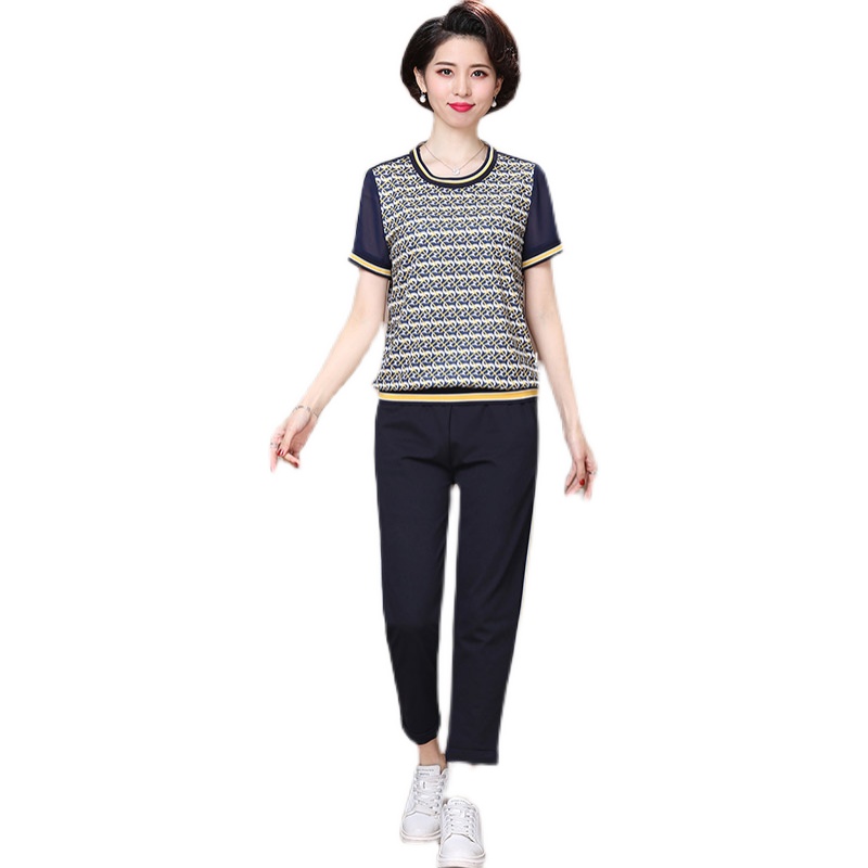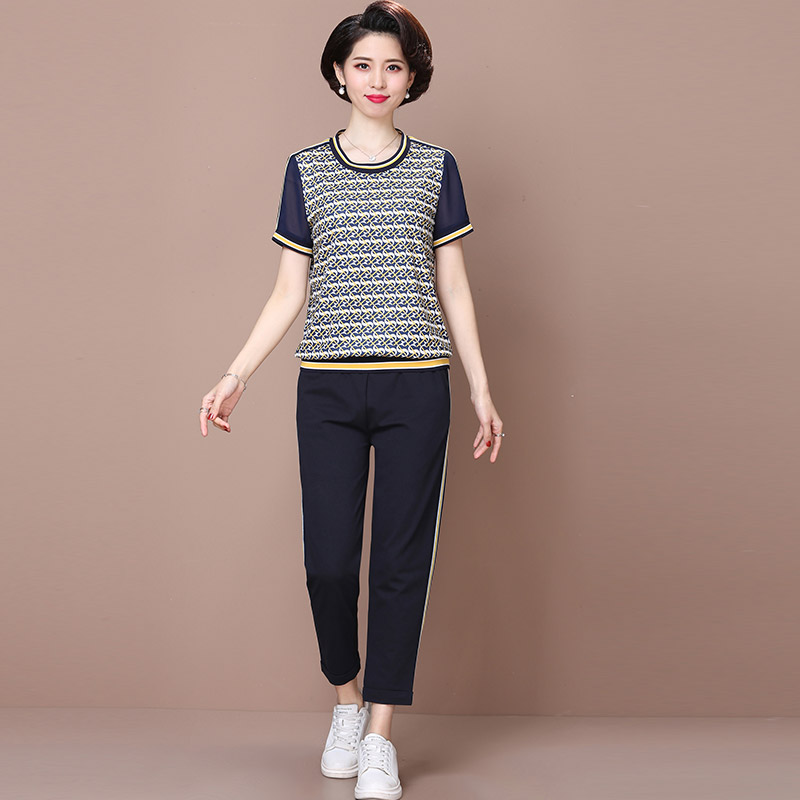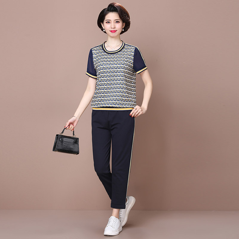 年轻妈妈运动服时尚洋气休闲圆领气质新款中老年女短袖两件套装夏