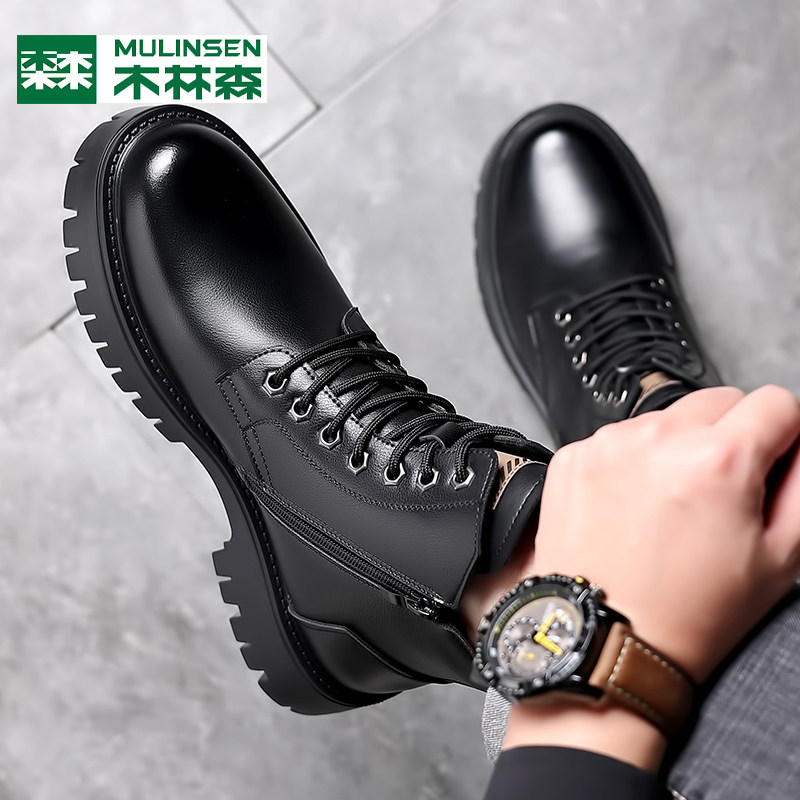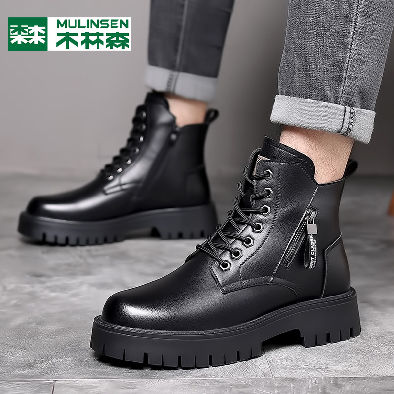 木林森马丁靴男款2025冬季加绒羊毛高帮棉鞋男真皮东北雪地工装靴