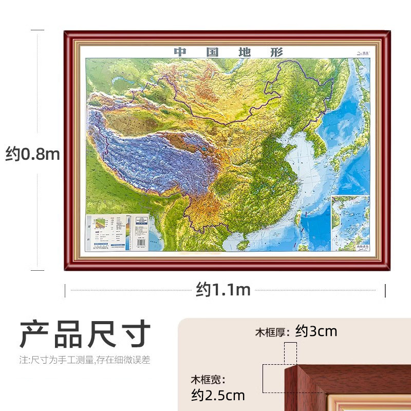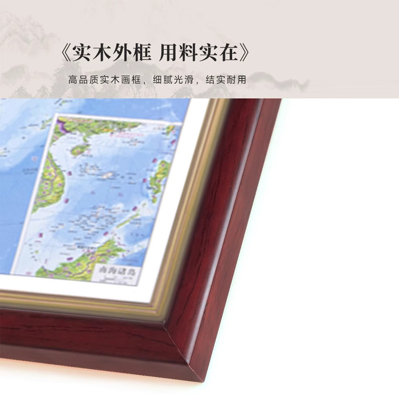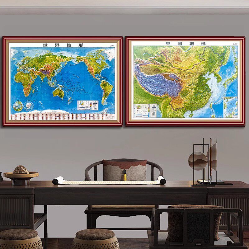 实木边框 2025年版中国地图和世界地图3d立体凹凸地形三维沙盘带框装裱 凹陷触感 家居展览馆居家沙发办公室背景墙装饰画