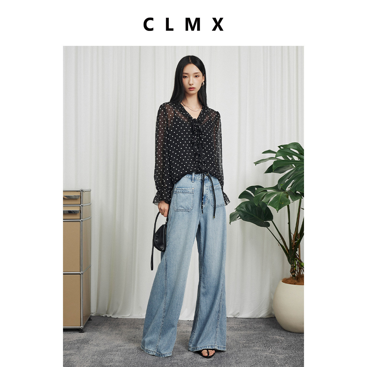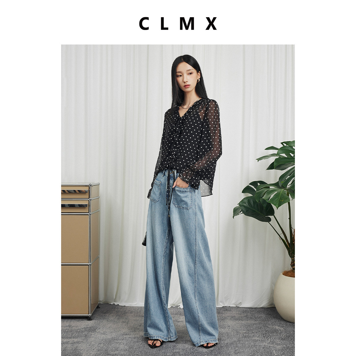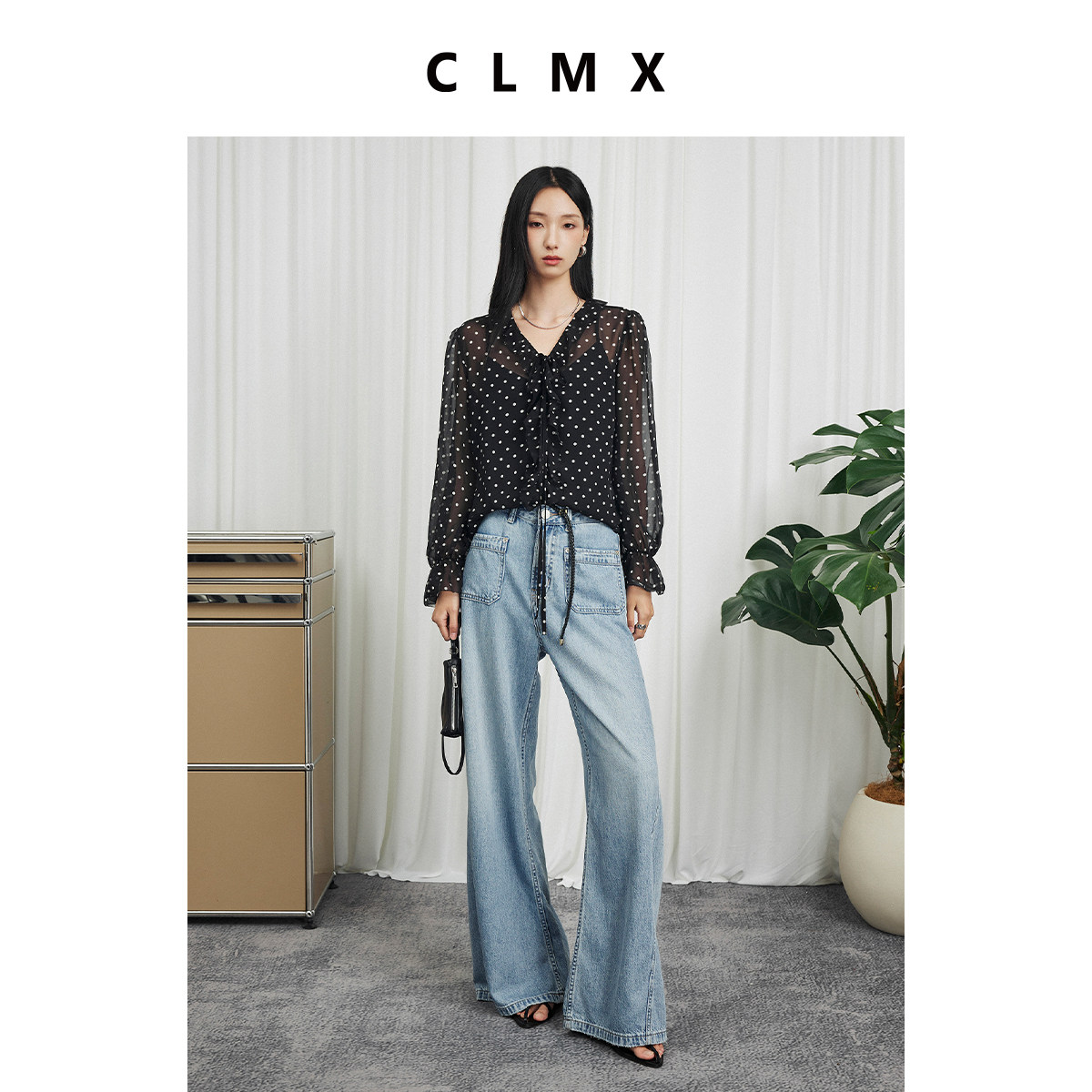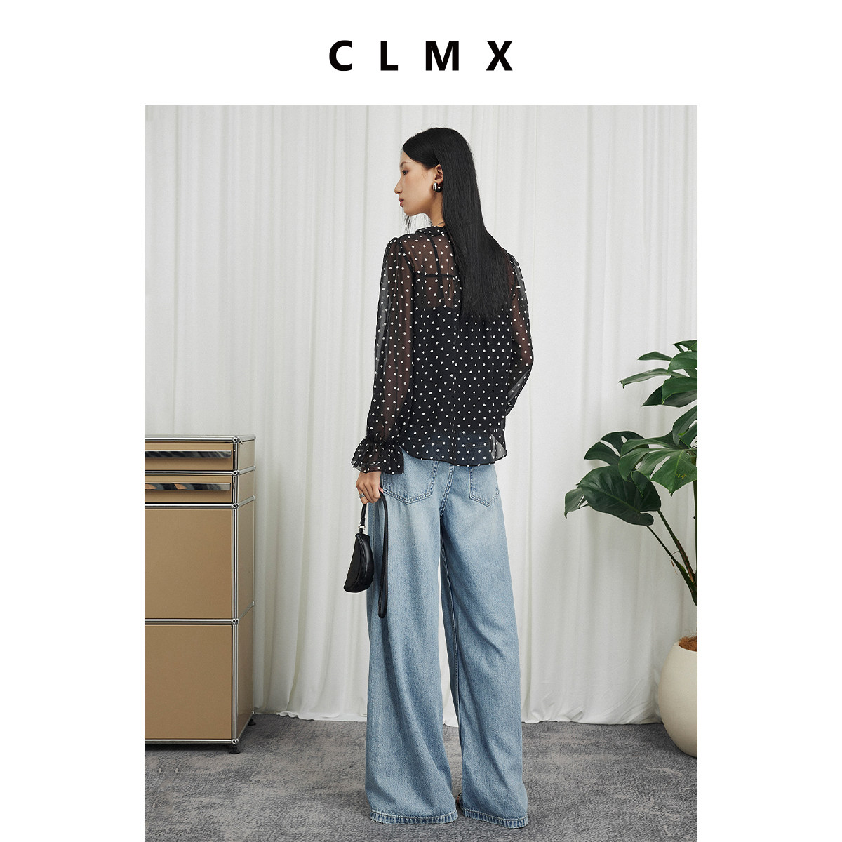 CLMX轻透复古波点平纹薄纱雪纺 复古小波点荷叶边V领衬衫+吊带