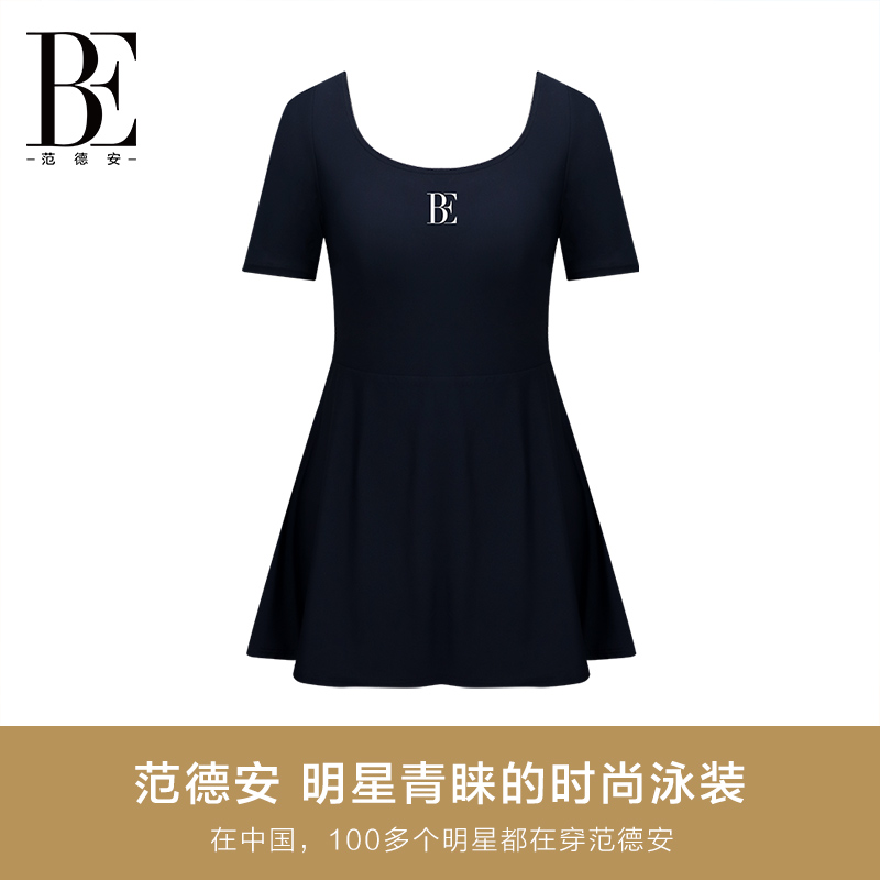BE范德安新款连体裙式泳衣女小黑裙短袖防晒遮肚显瘦温泉度假泳装