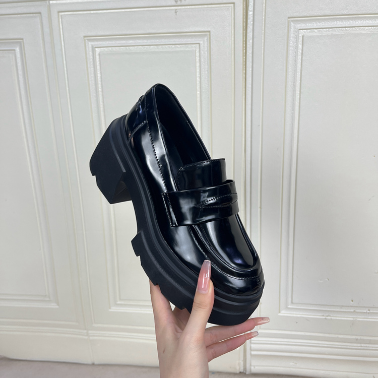 真皮圆头厚底单鞋粗高跟乐福鞋
