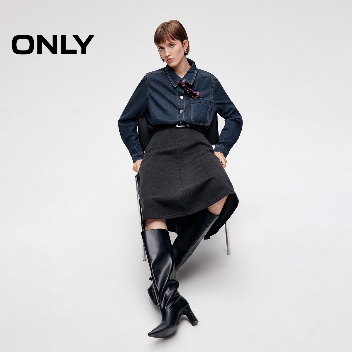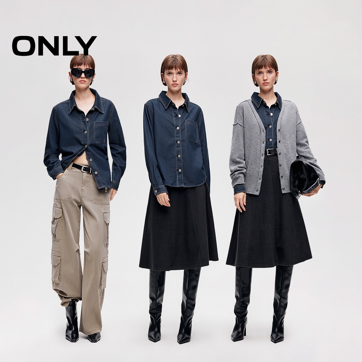 ONLY2026春季新款灵动圆弧形下摆设计正肩长袖翻领牛仔衬衫女