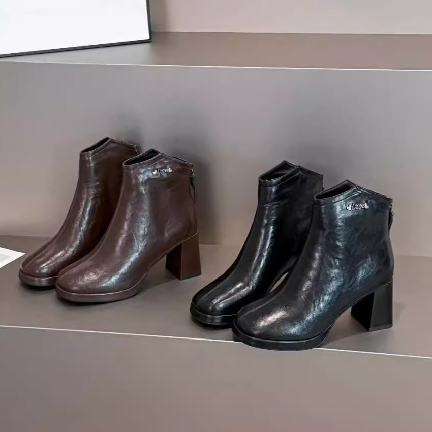 老牌子粗高跟方头女靴2025秋冬新款825059软皮压花后拉链薄绒短靴