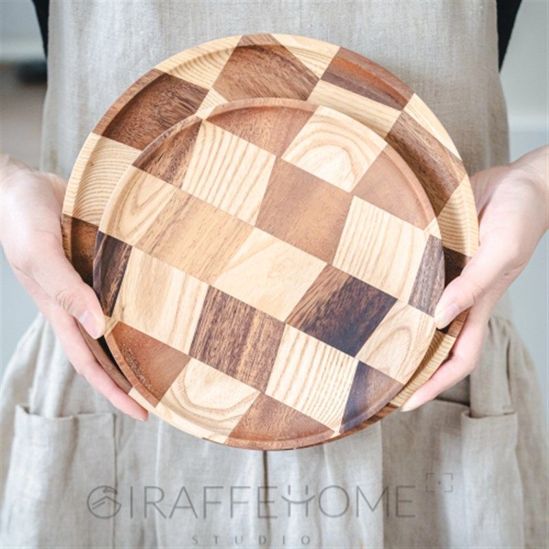 木拼接棋格盘圆形实木创意餐盘果盘盘茶盘白蜡木胡桃木