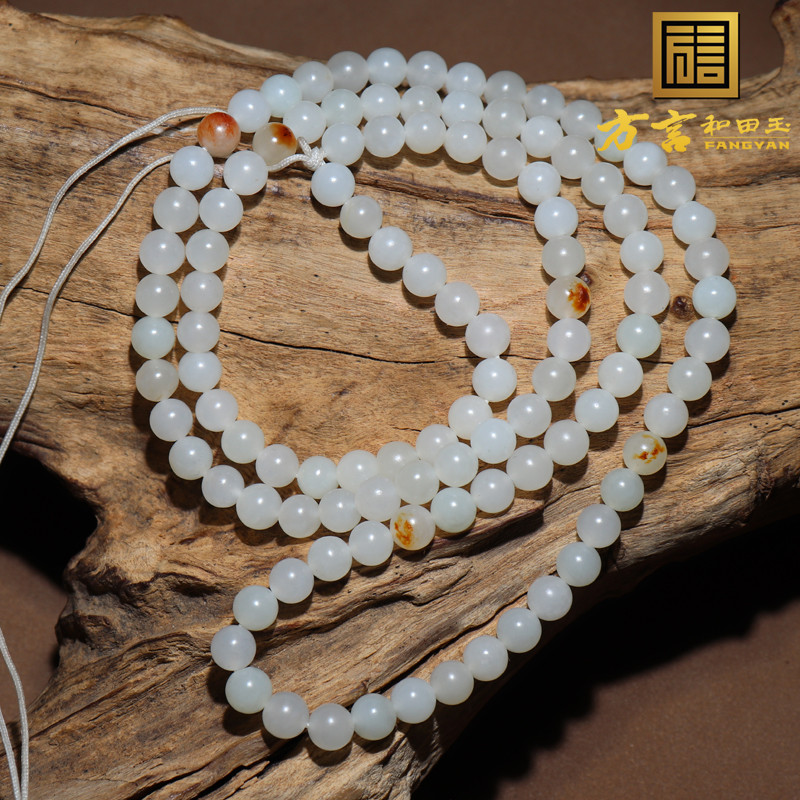 方言和田玉收藏玉龙河羊脂白玉籽料留皮孔聚红金皮6mm圆珠项链O2