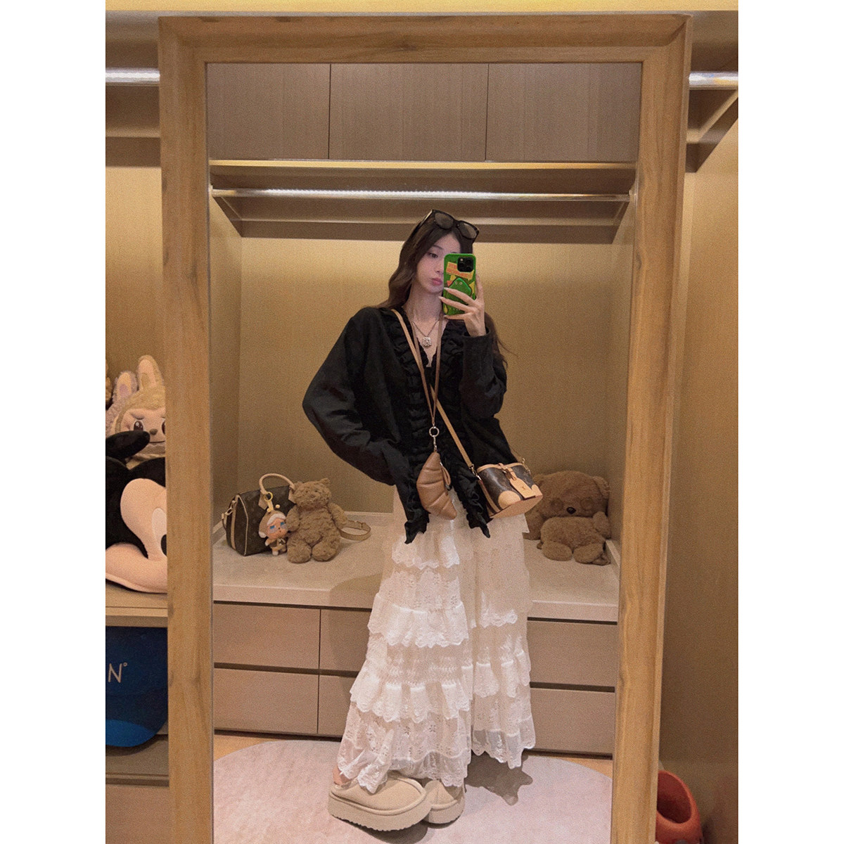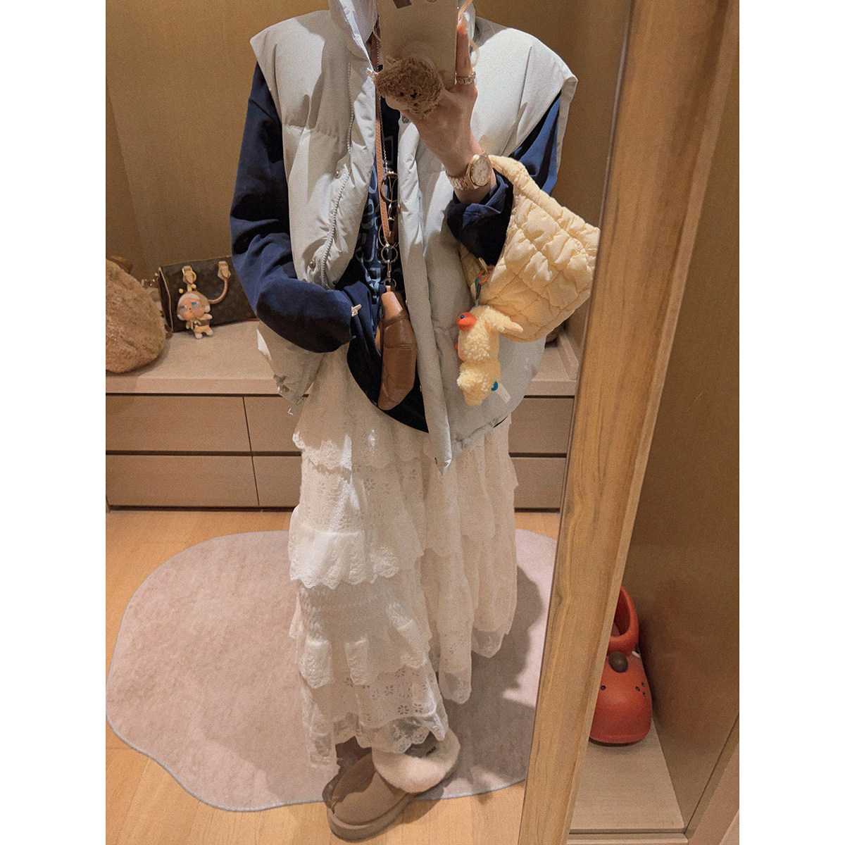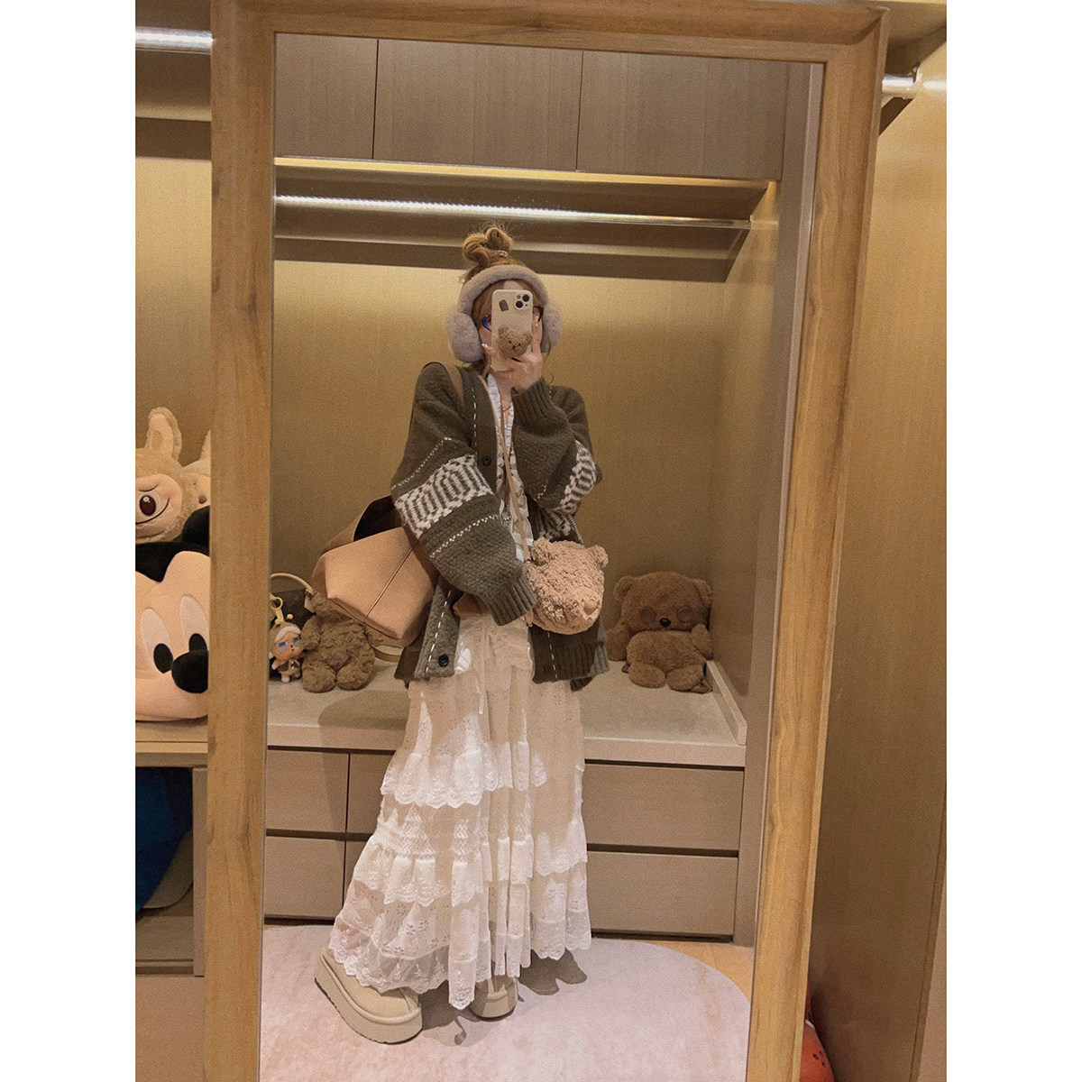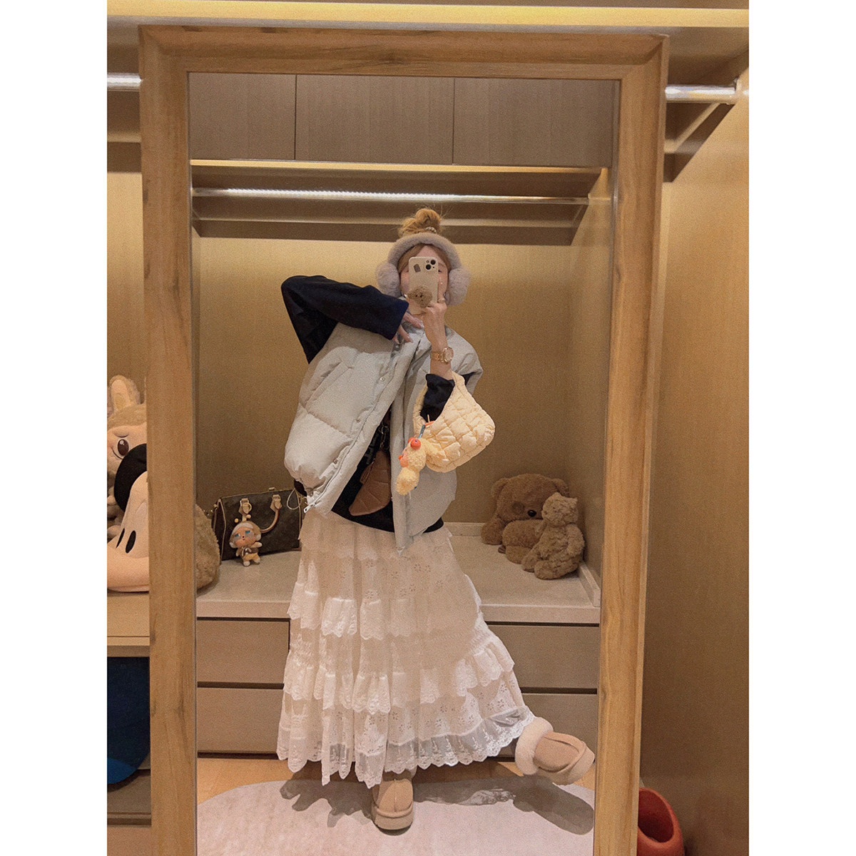 Yukiss【内里加绒!米白色毛绒感蕾丝拼接半身长裙】