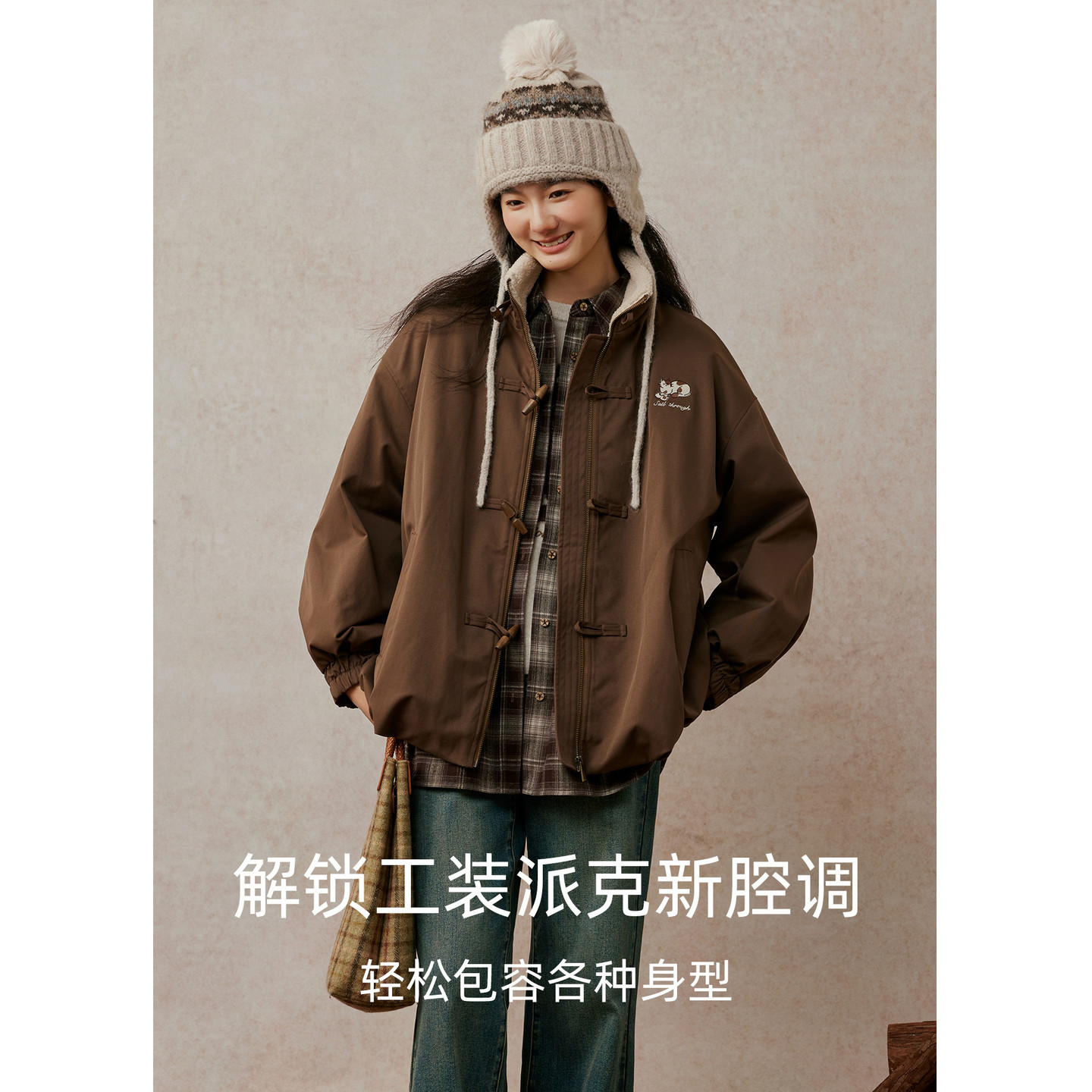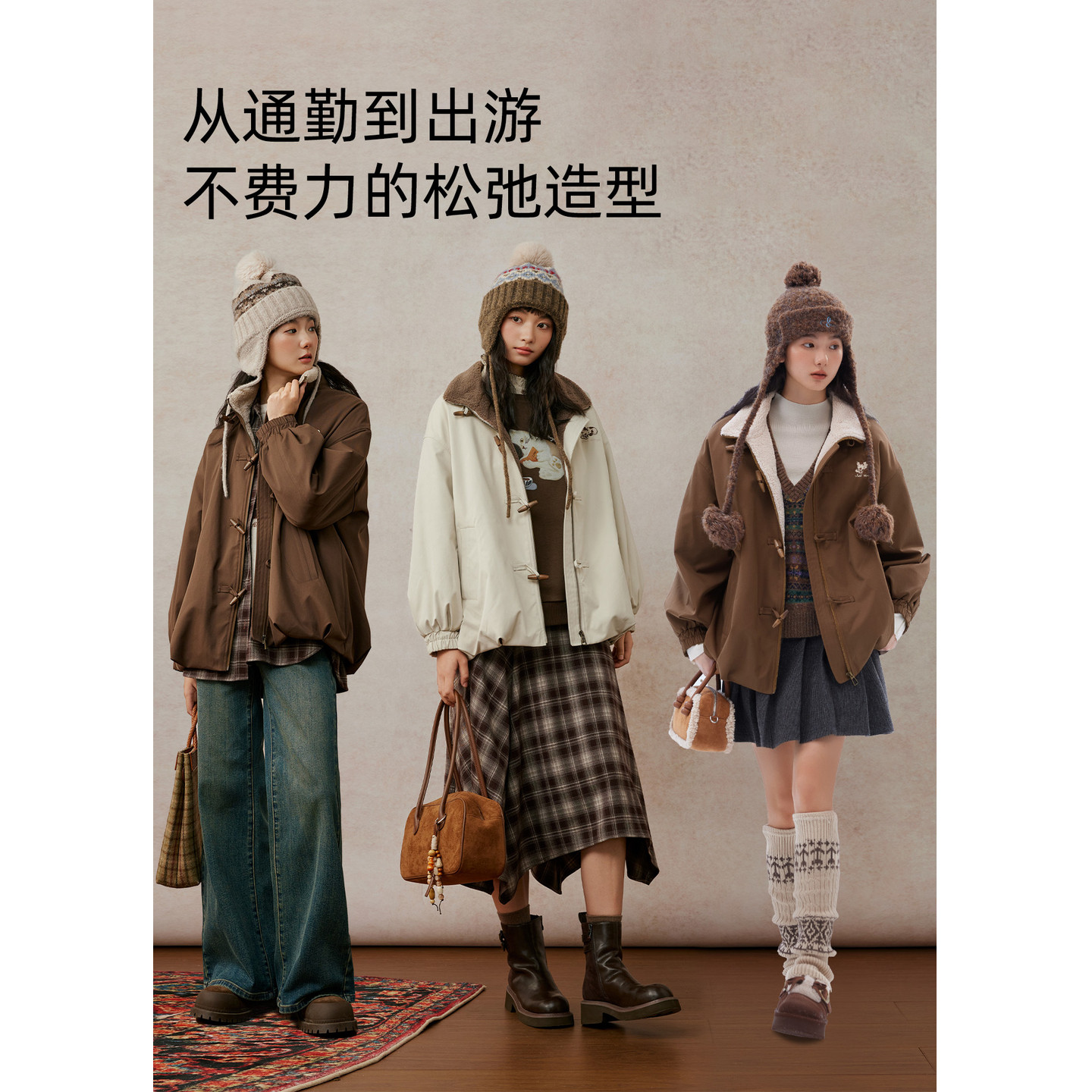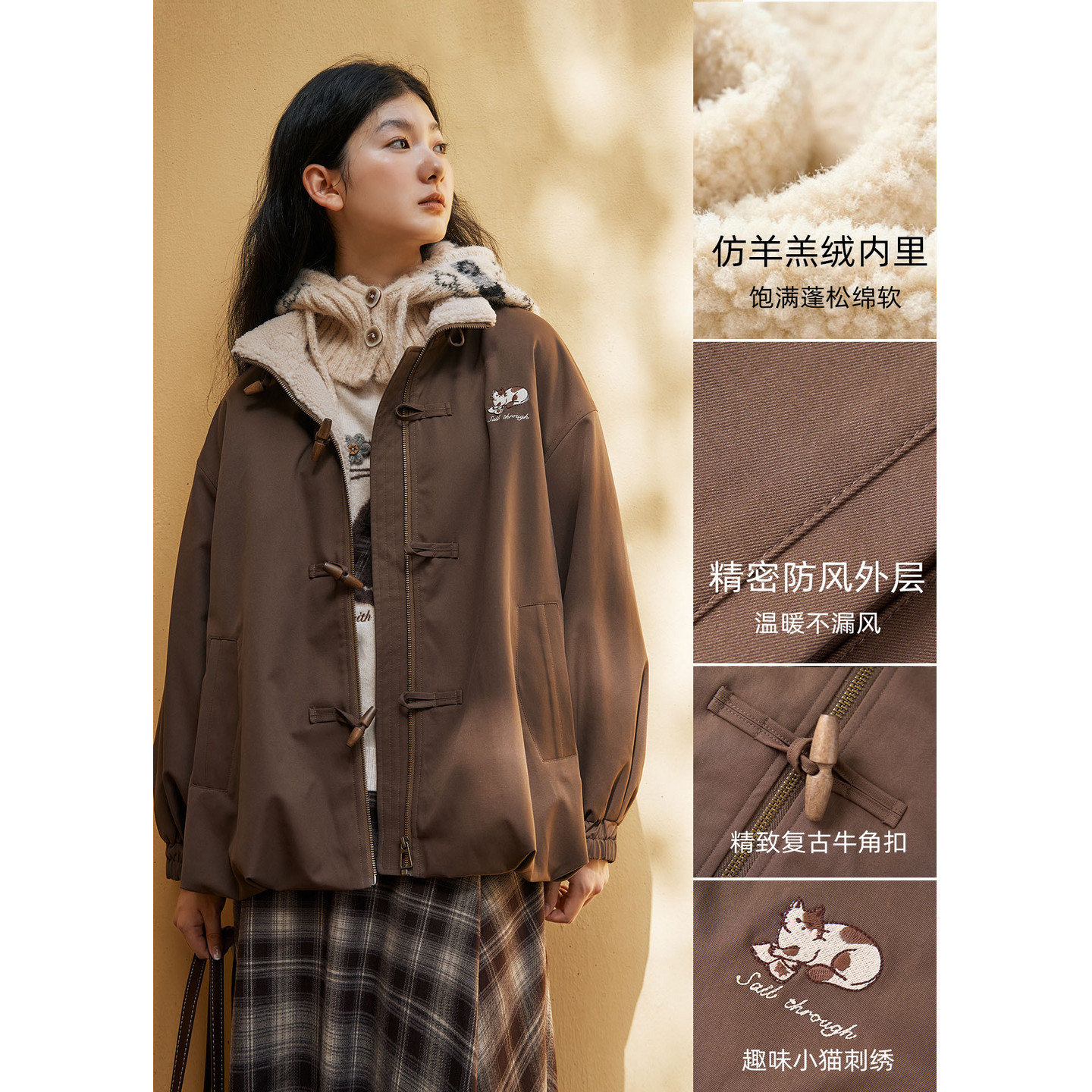 紫涵立领短外套女2025年冬季新款仿羊羔毛加绒牛角扣拉链夹克上衣