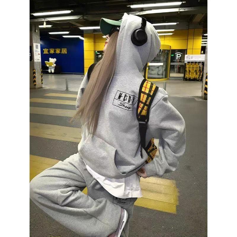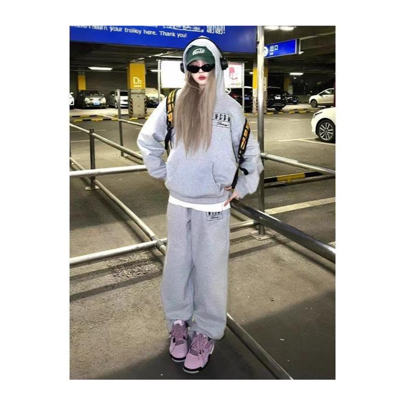 美式复古运动服套装女春秋新款灰色宽松大码卫衣阔腿裤两件套跑步