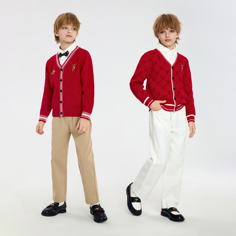 POLOWALK童装男童假两件针织衫2025年秋冬儿童学院风红色纯棉毛衣