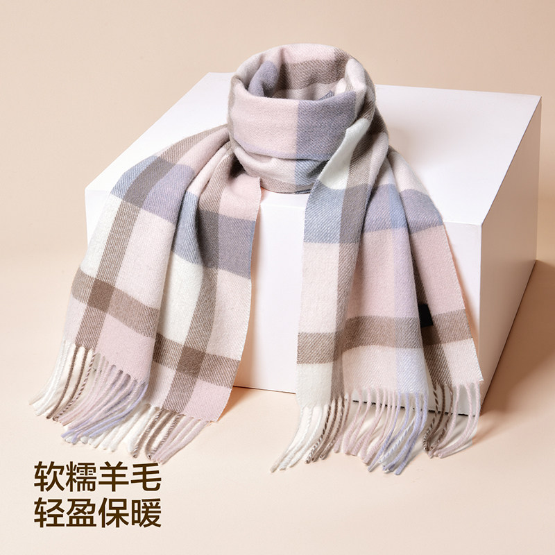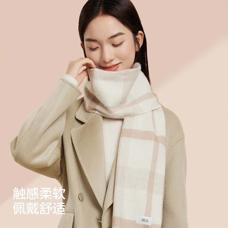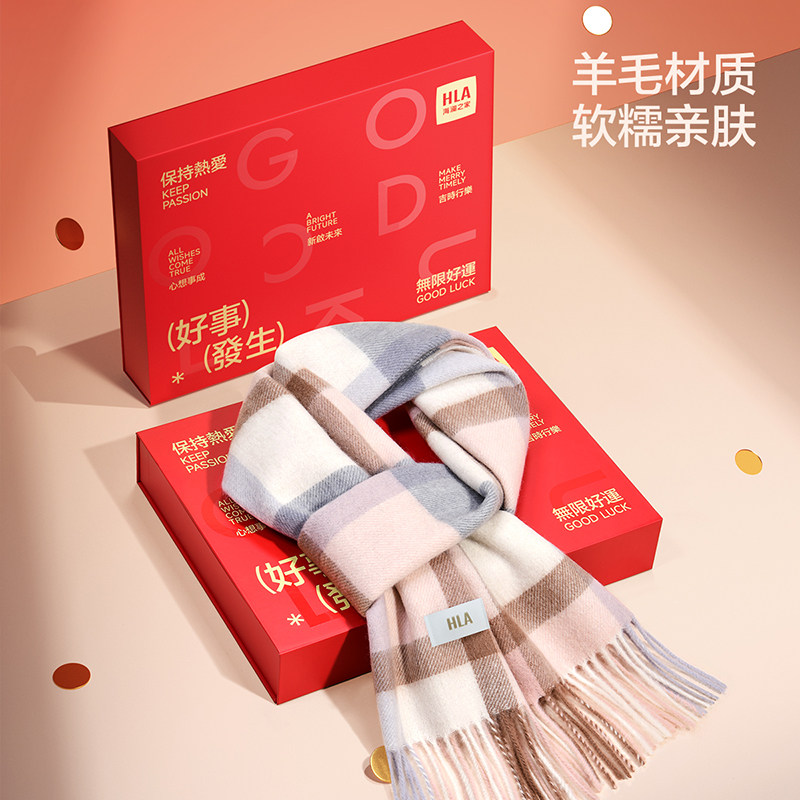 HLA/海澜之家绵羊毛围巾礼盒女士秋冬新款保暖送女友格子流苏围脖