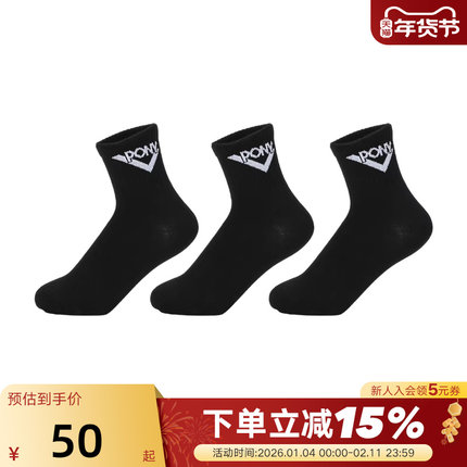 PONY波尼男女大童袜黑色中袜经典系列运动袜三双装241K3AI02BK