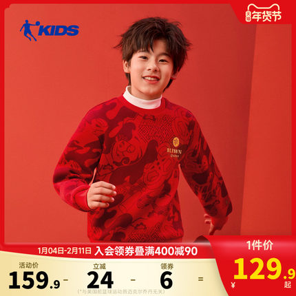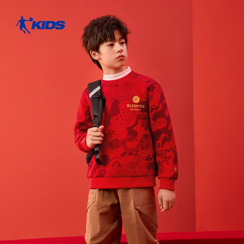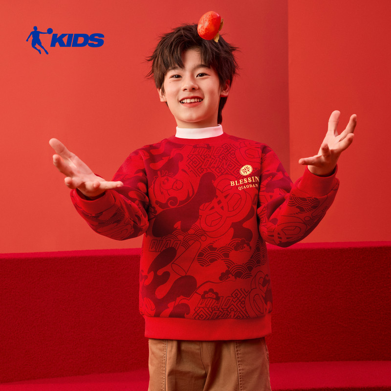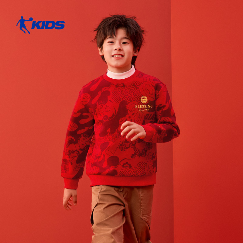 才骅加马|乔丹儿童新年红色卫衣男童马年圆领拜年服大童过年衣服