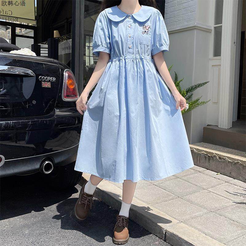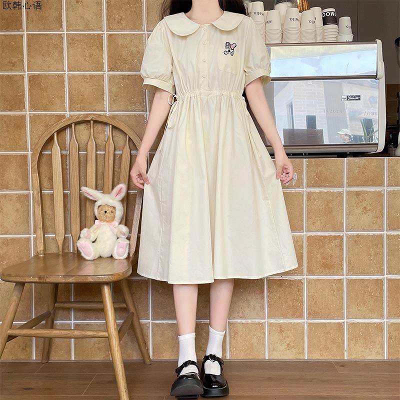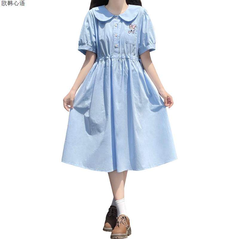 娃娃领刺绣连衣裙少女夏装初高中学生减龄学院风甜美收腰中长裙子