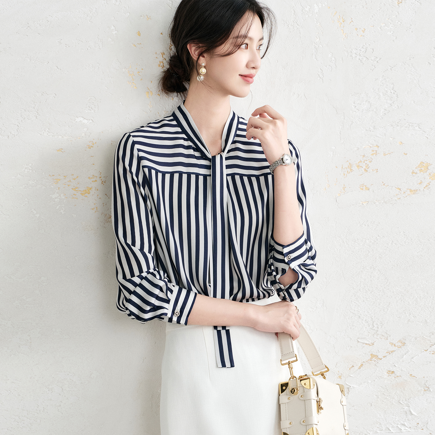 OFFIY-浪漫职业感 高端小资条纹上衣早秋通勤印花飘带长袖衬衫新