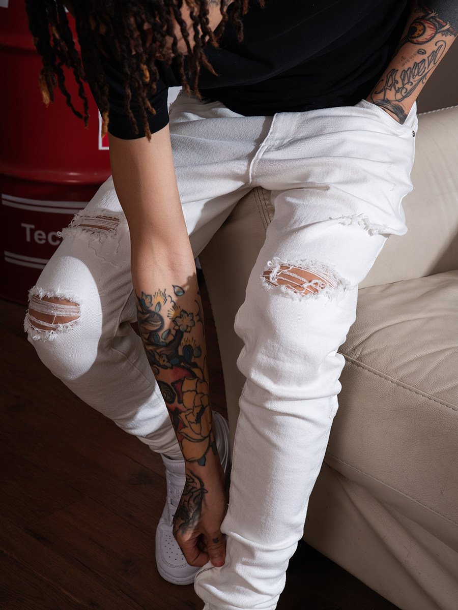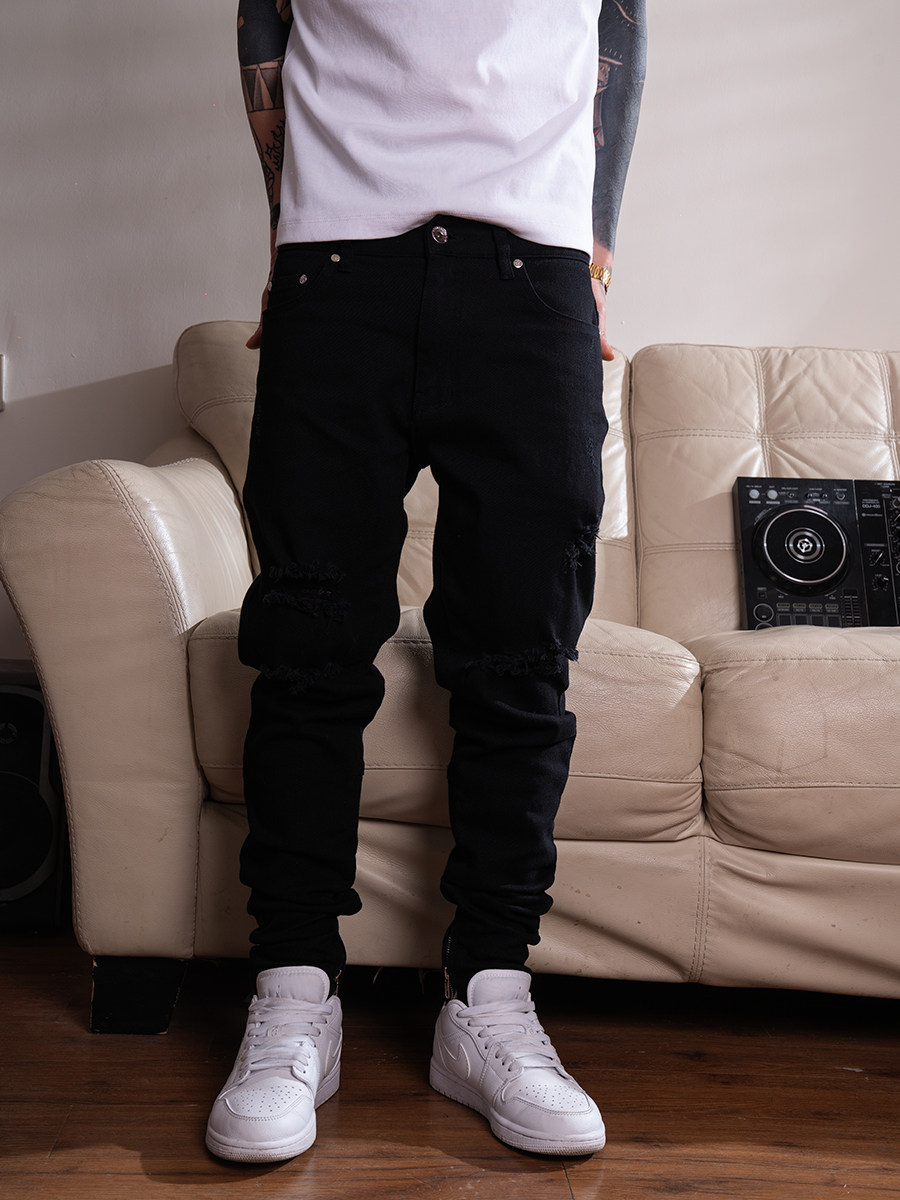 TGFCLUB 美式街头rapper潮牌基础百搭弹力水洗破洞修身小脚牛仔裤