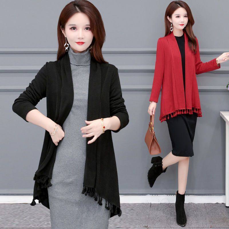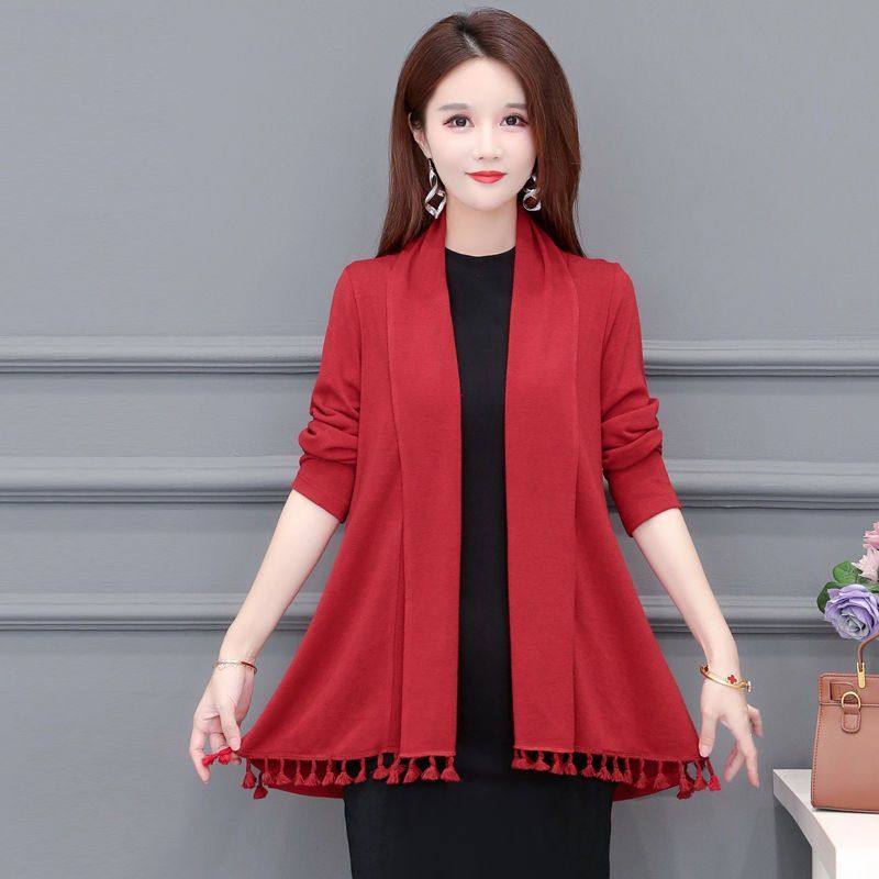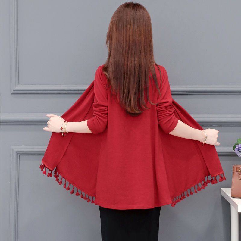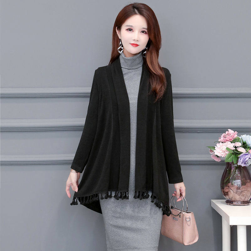 春秋中长款针织外套长袖流苏小外搭女大码纯色百搭显瘦轻薄开衫
