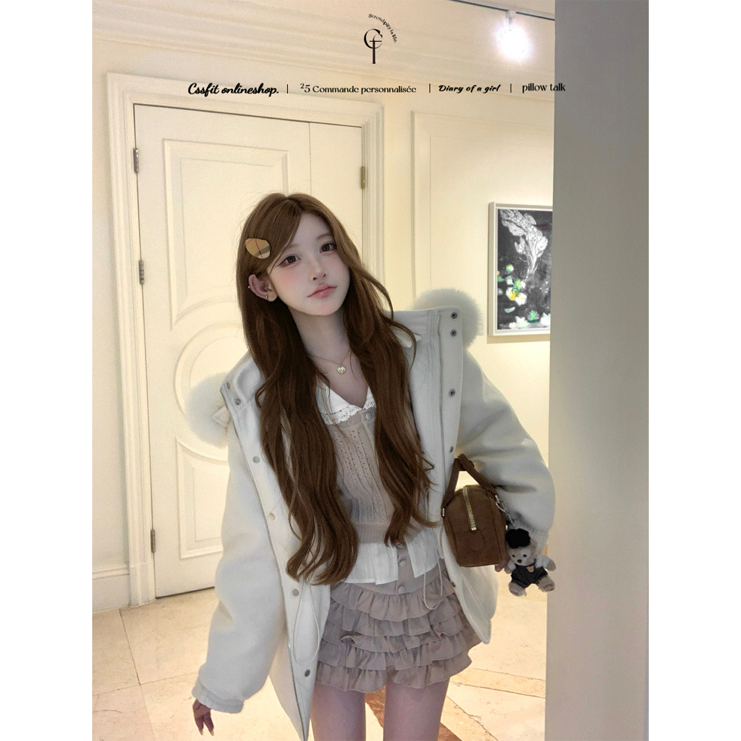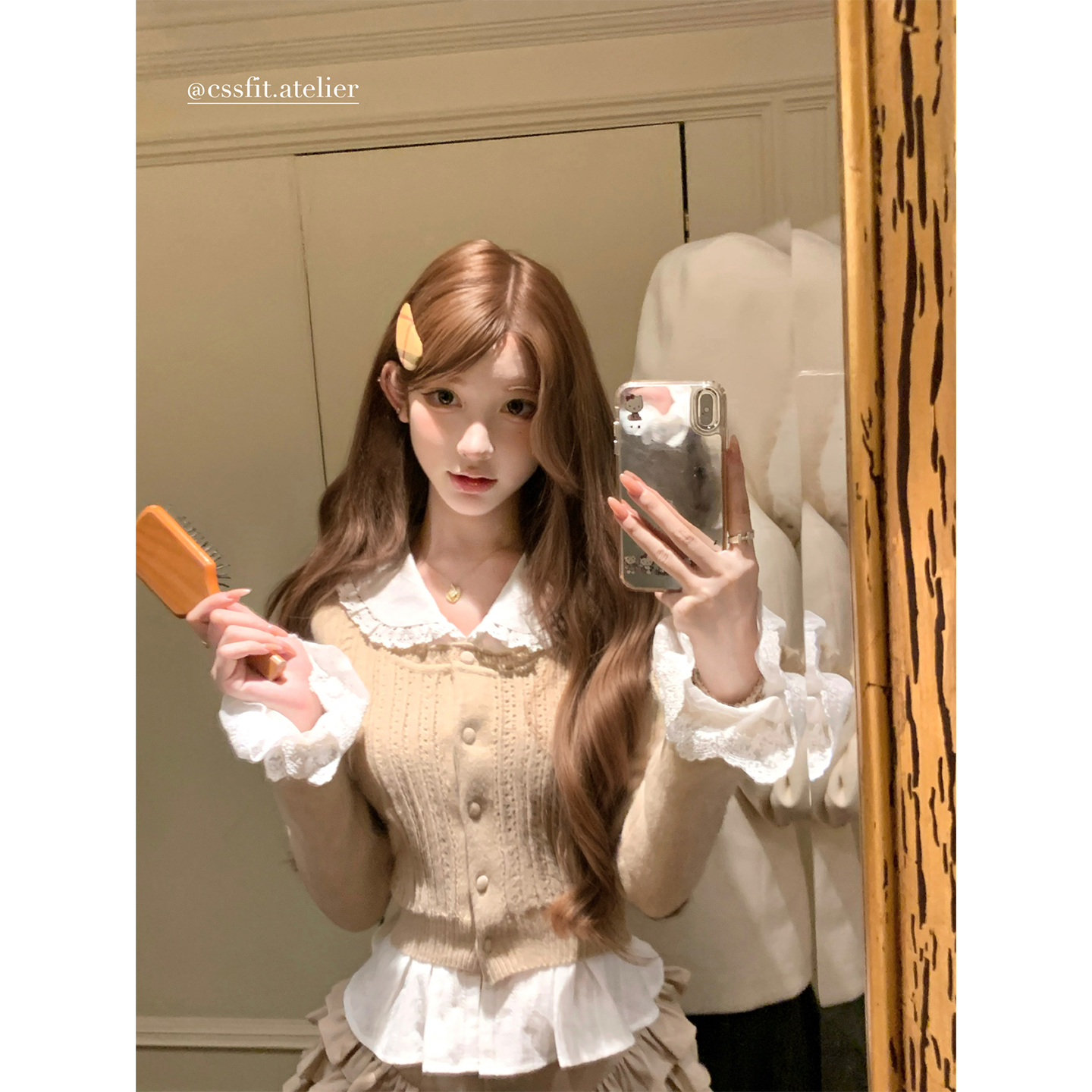 迟伞伞25/fw摩卡栗栗 镂空麻花开衫/肌理感纯棉衬衫奶咖短裙套装