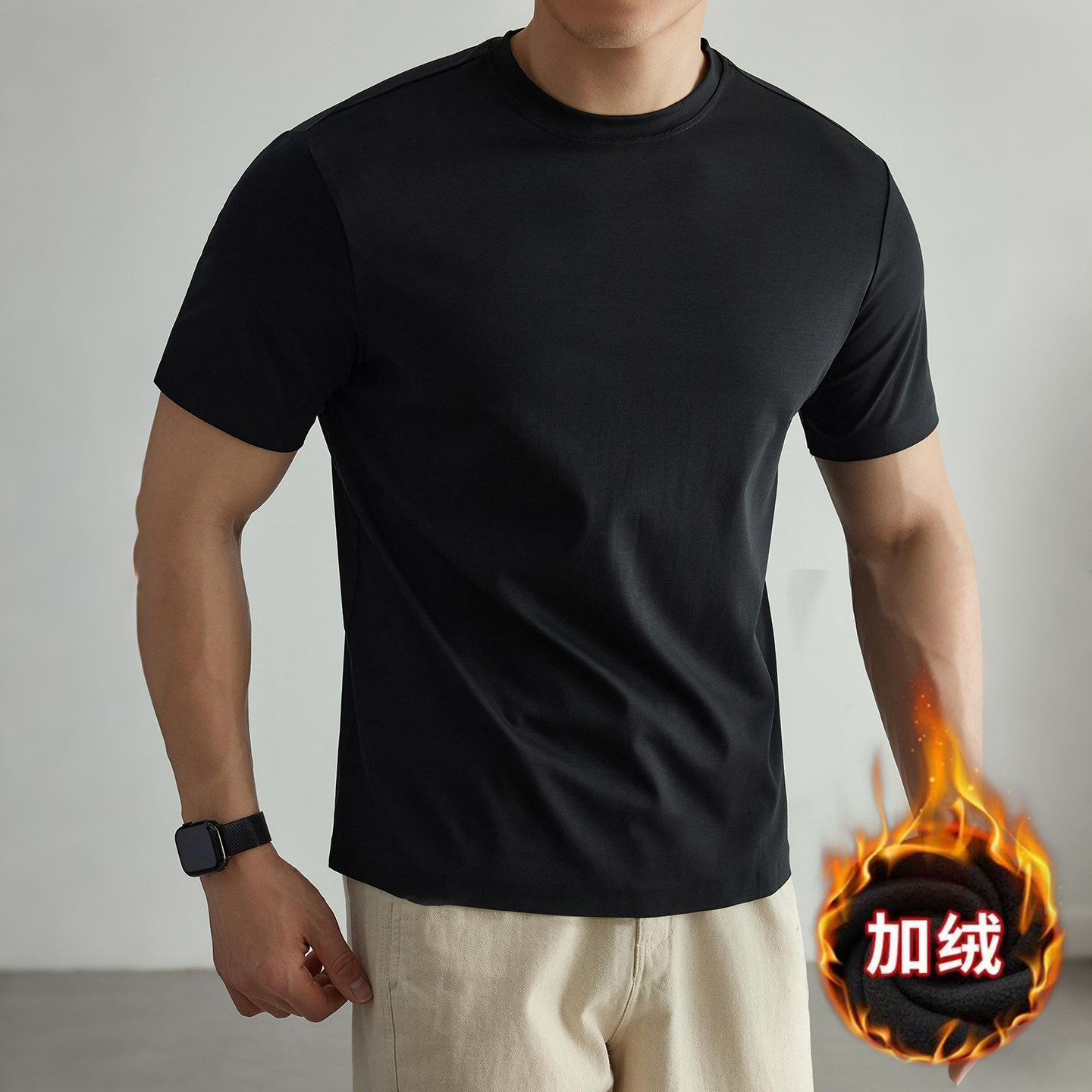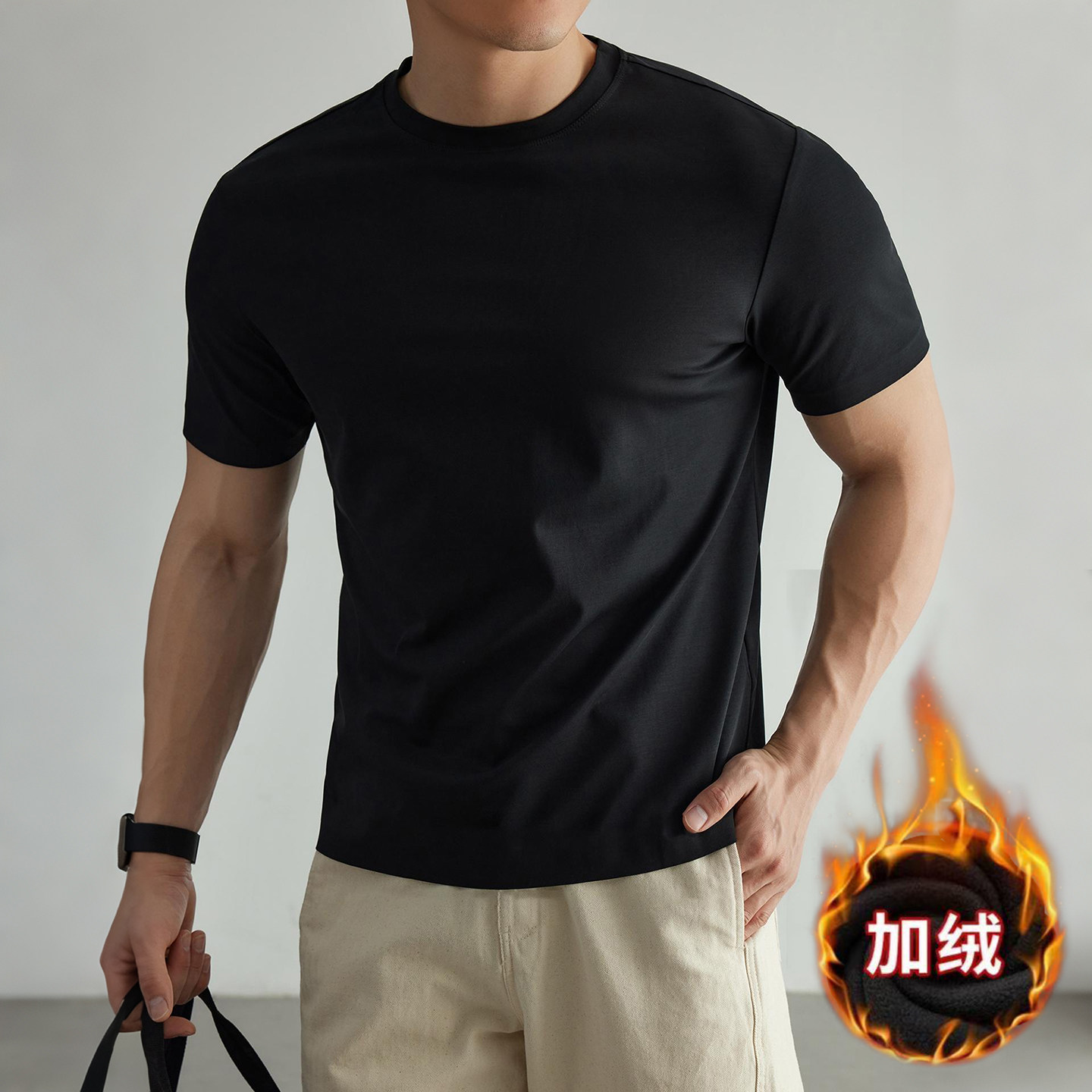 秋冬轻奢极简风男士健身圆领短袖T恤保暖上衣加绒运动打底内搭白t