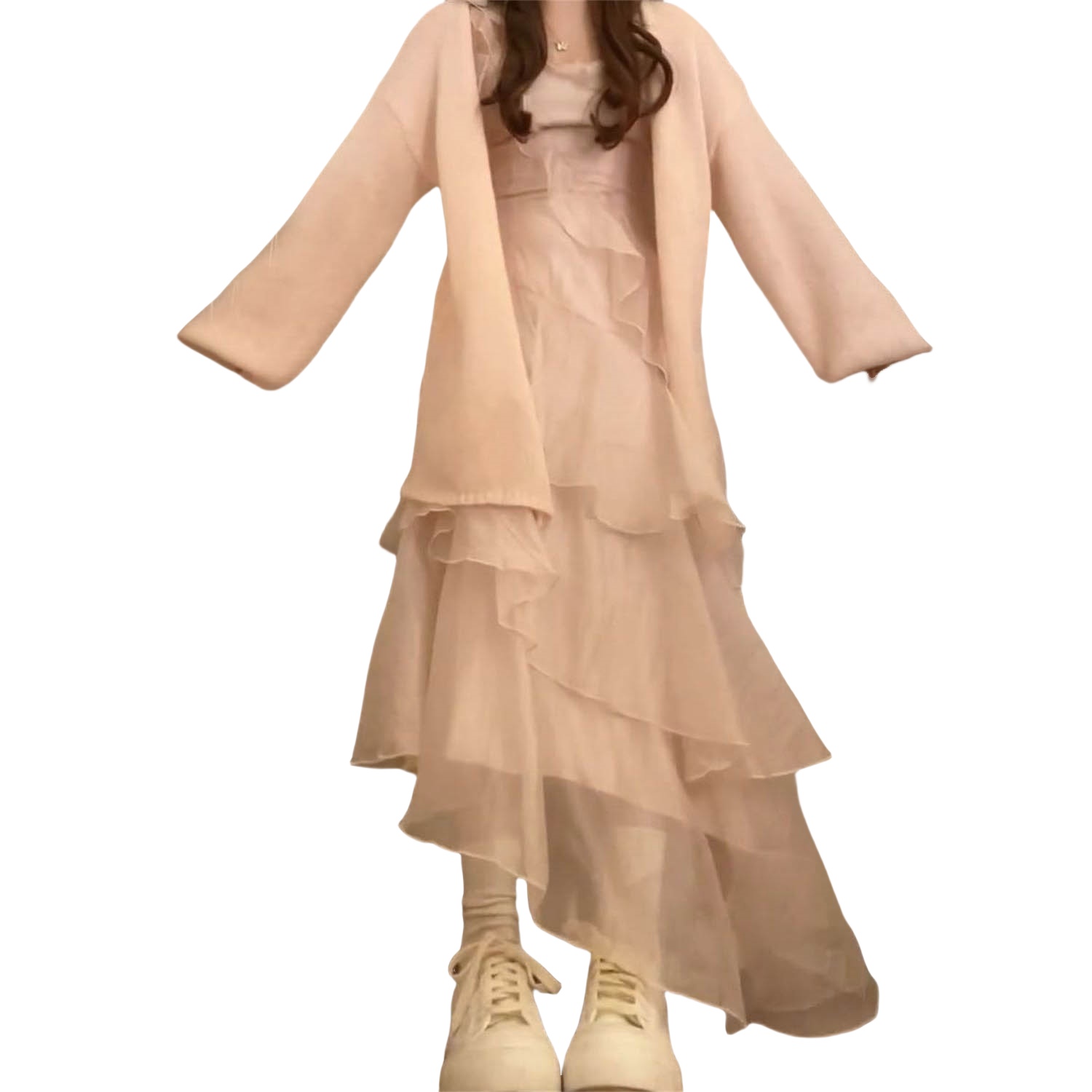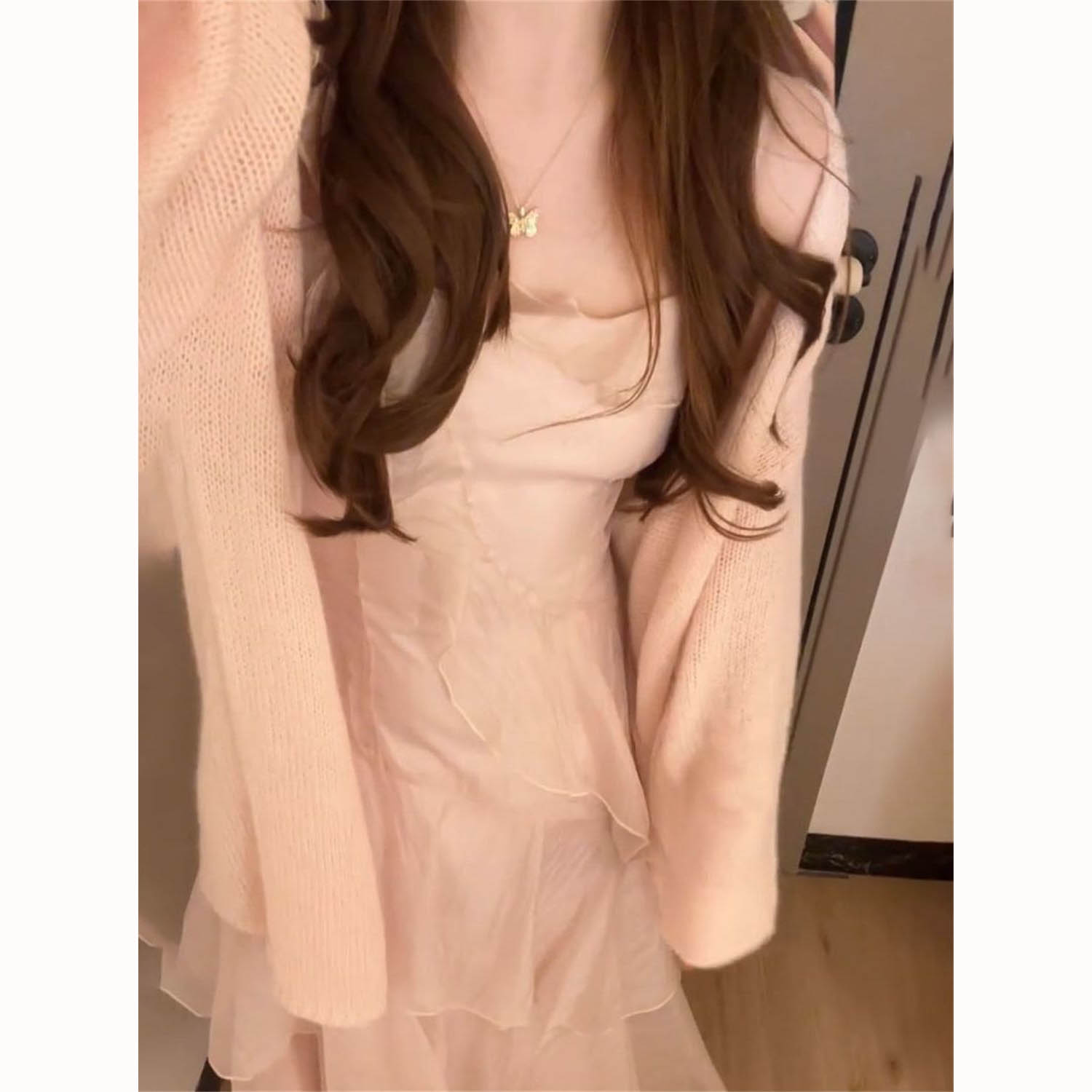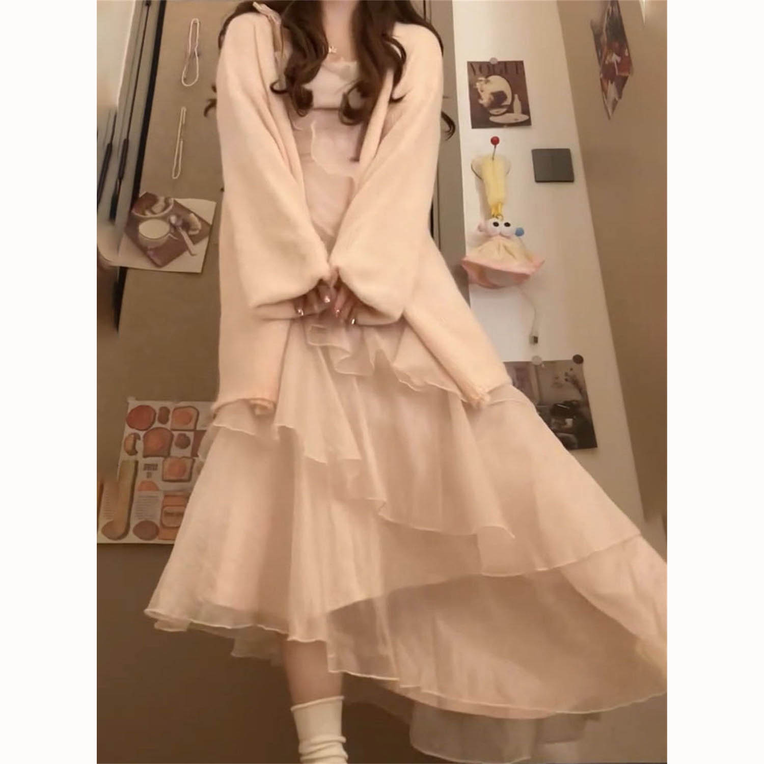 荷叶边吊带连衣裙+针织衫毛衣