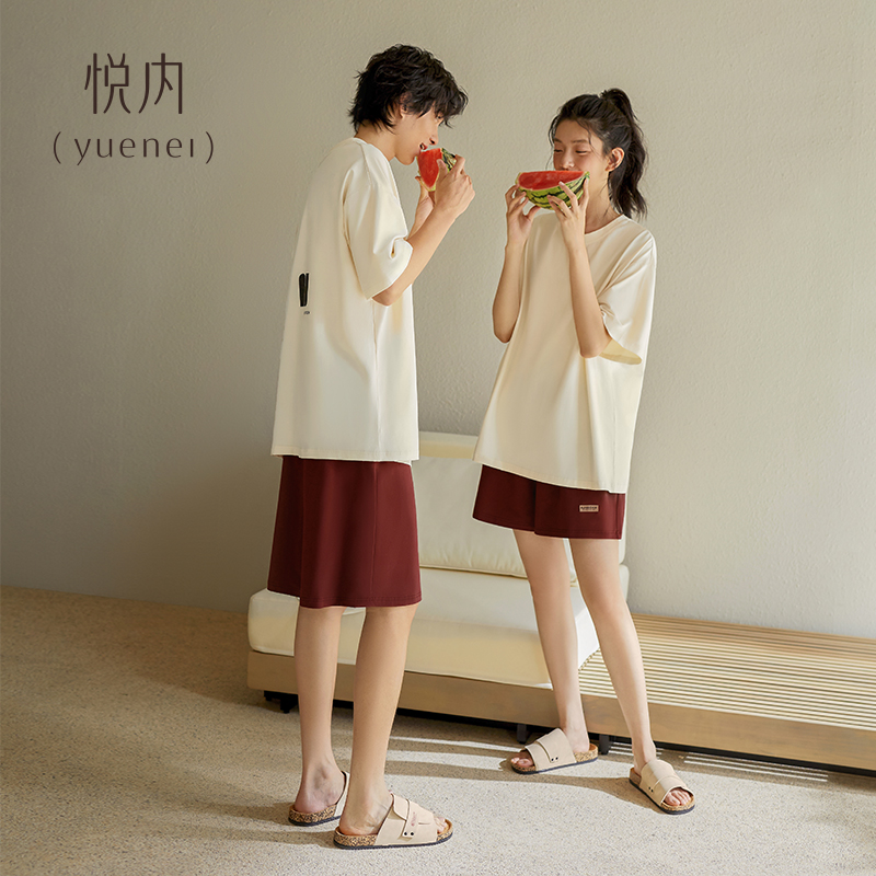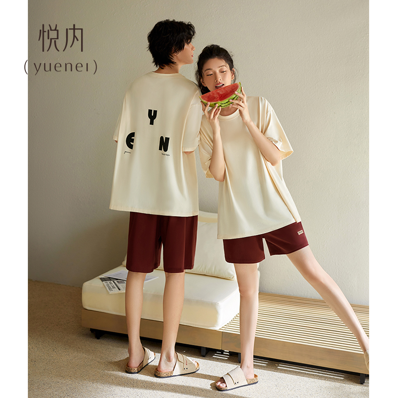 悦内情侣睡衣女款夏季夏天纯棉短袖短裤带胸垫家居服男士休闲套装