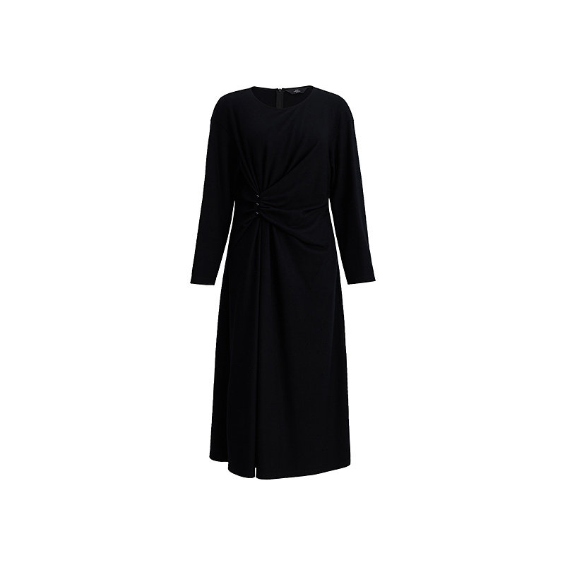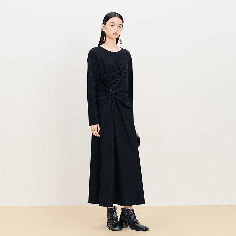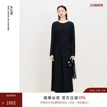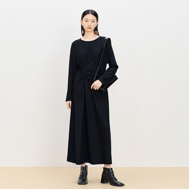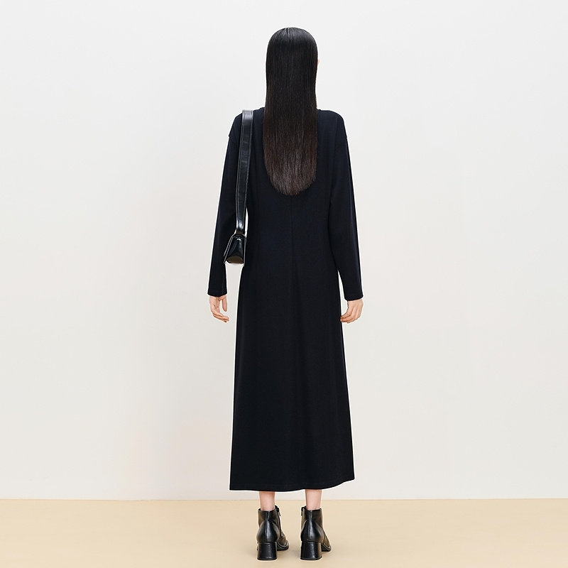 AUM噢姆冬季可机洗羊毛圆领收腰连衣裙黑色休闲长裙