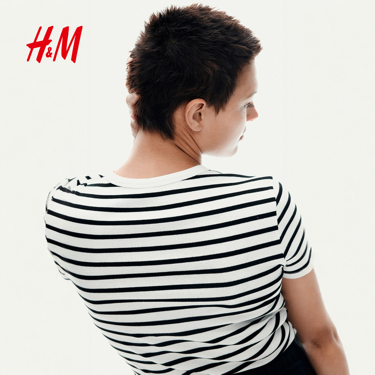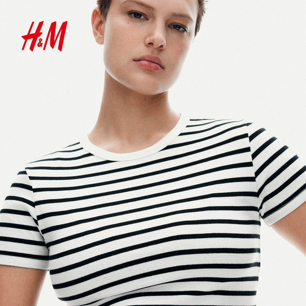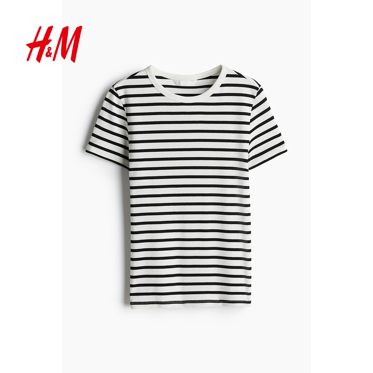 HM女装T恤春季时尚修身短袖窄边领口直筒下摆上衣1260556