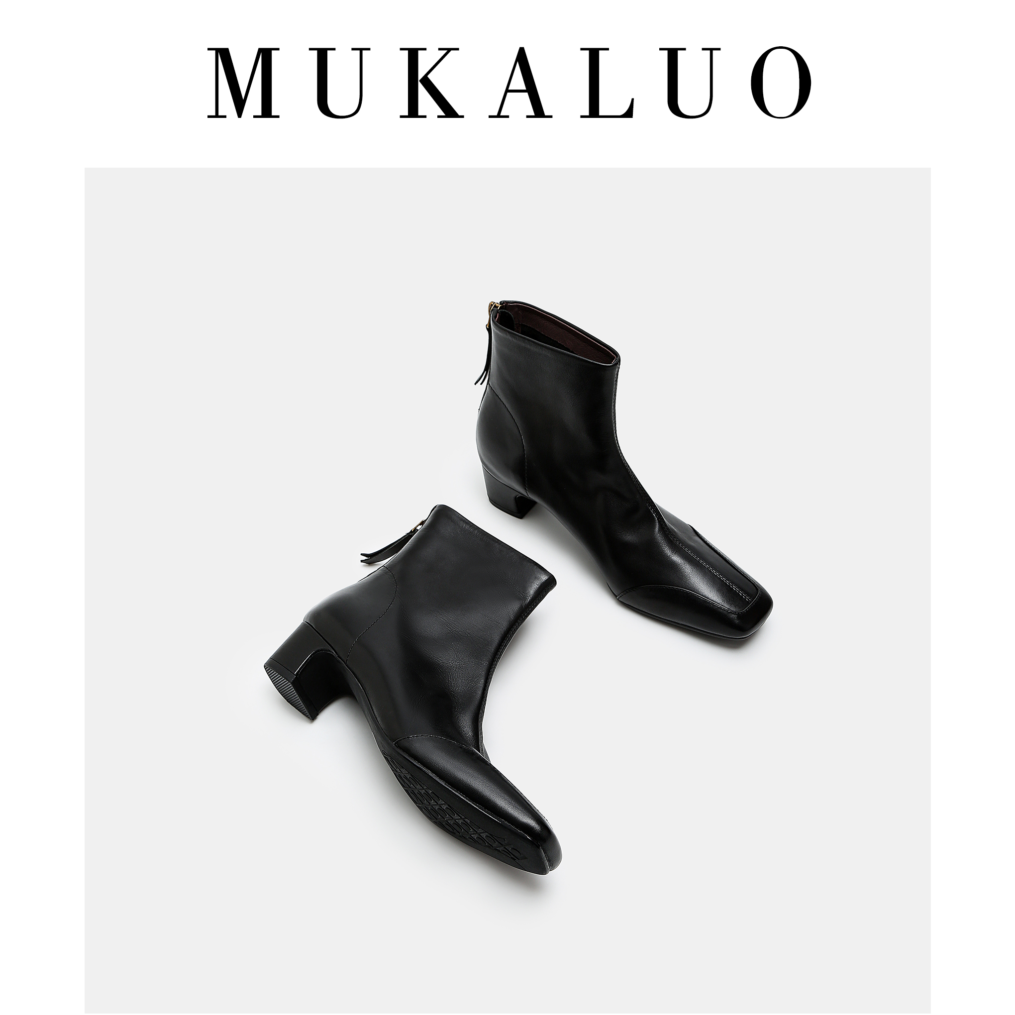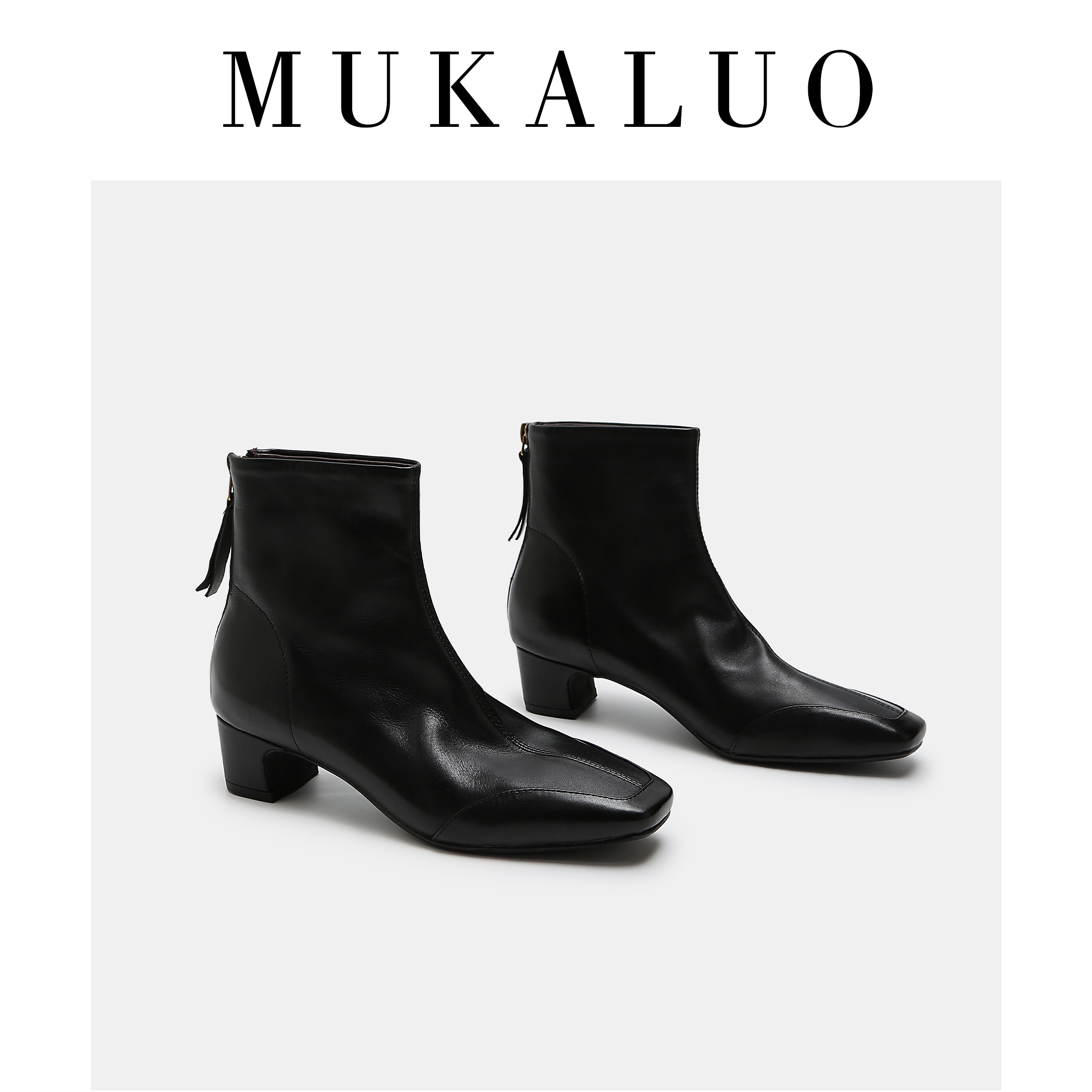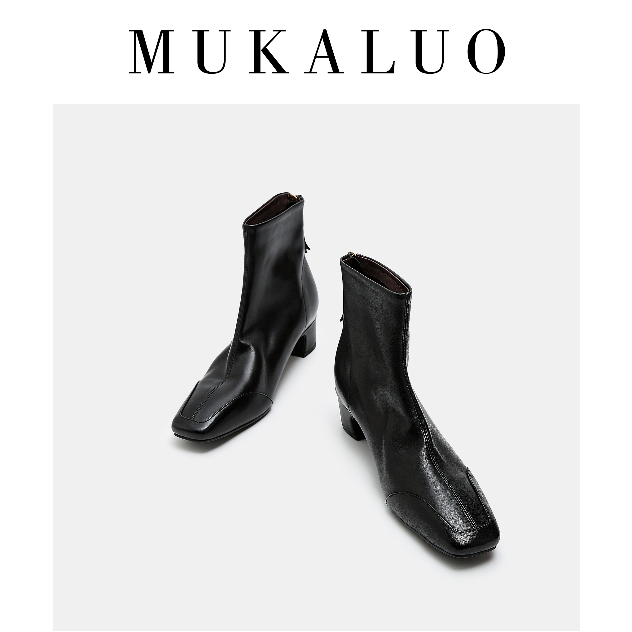 方头粗跟短靴女真皮2025春秋新款后拉链显瘦百搭中跟软皮软底裸靴